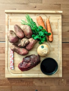 Couper les carottes en morceaux irréguliers à multiples facettes. Couper chaque oignon en 6 à 8 quartiers. Couper le bœuf en lanières de 5cm.