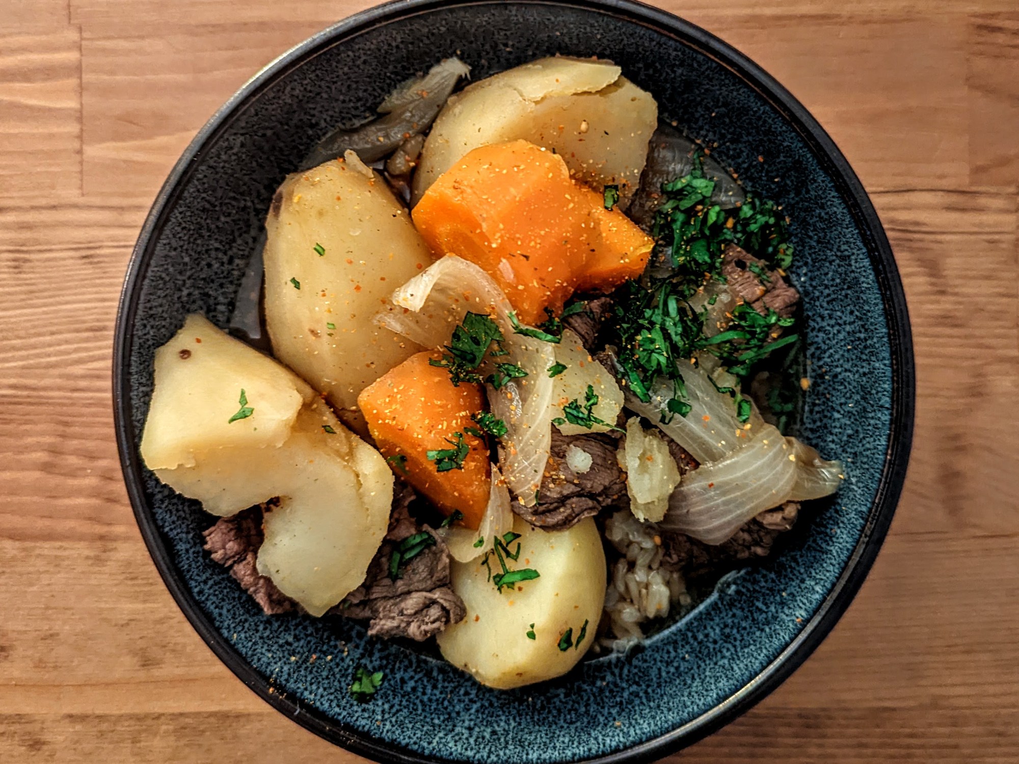 Égouttez et rincez les pommes de terre. Ajouter à la casserole avec les carottes, les oignons et 400ml. Porter à ébullition et ajouter la sauce soja, le mirin, le saké et le sucre. Ajouter le bœuf en remuant pour répartir.