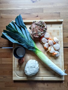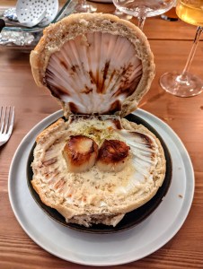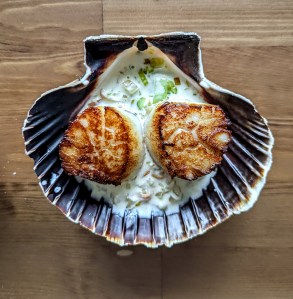 Dans chaque fond de coquille propre placez un bouquet de poireau, un peu de sauce et 2 noix de Saint-Jacques.