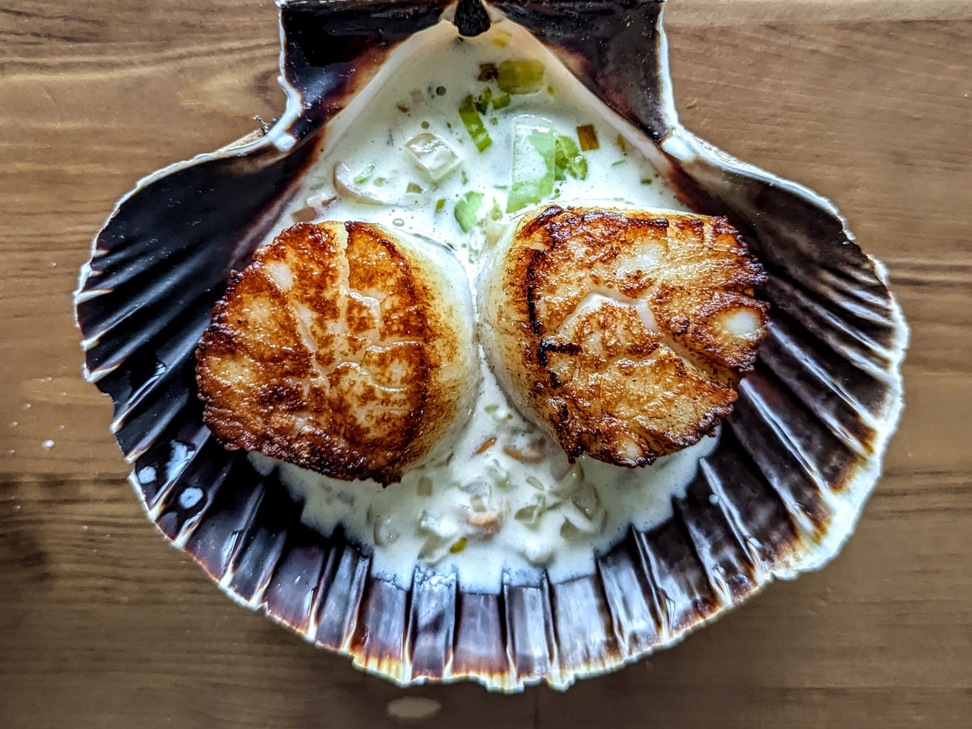 Dans chaque fond de coquille propre placez un bouquet de poireau, un peu de sauce et 2 noix de Saint-Jacques.