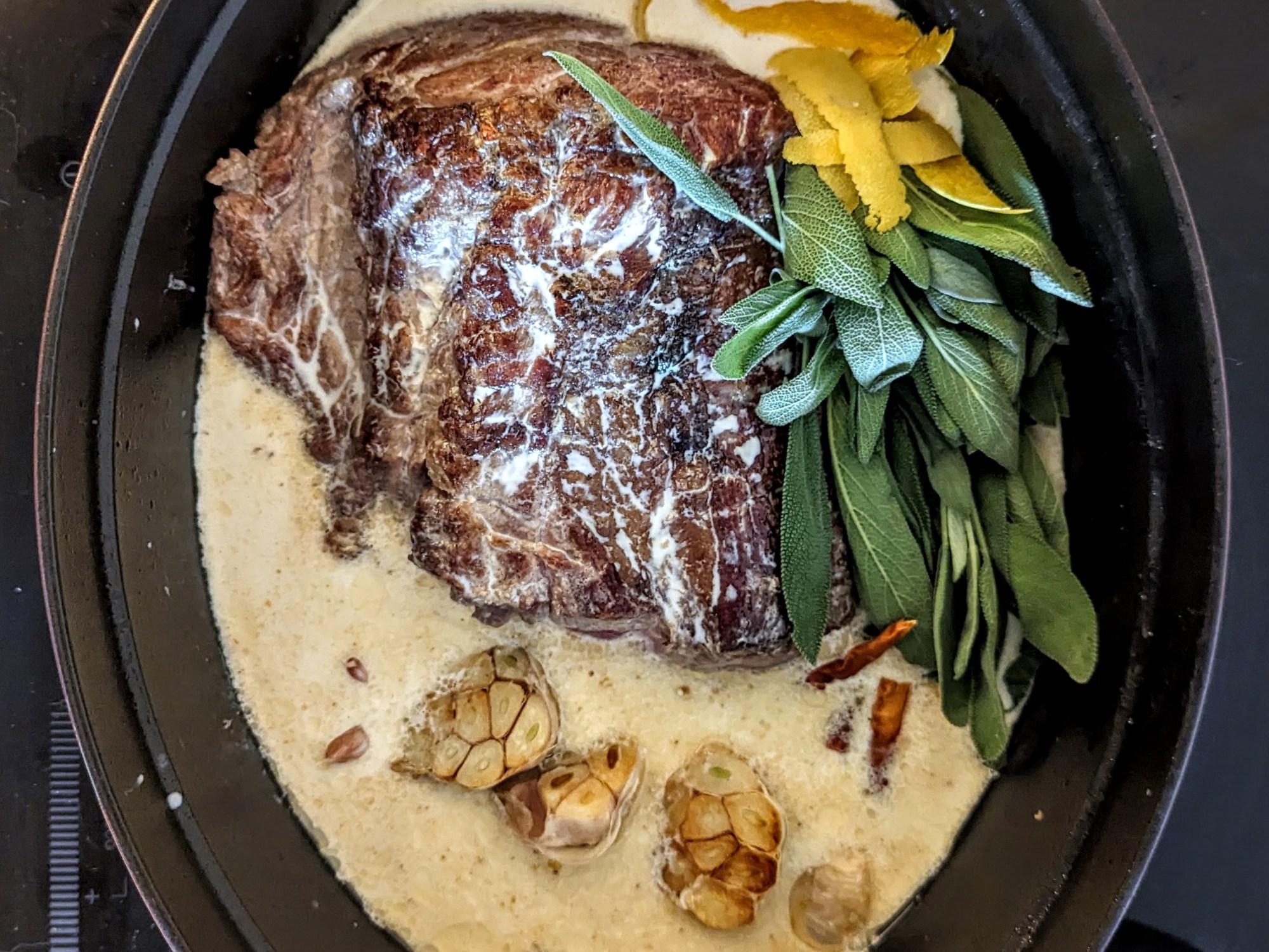 Remettre l’ail et rajouter le lait, citron, sauge et piment. Mettre au four, découvert, et tourner l’chine toutes les 30 minutes, pour 3h en tout (Jusqu’à ce que la viande soit très tendre).