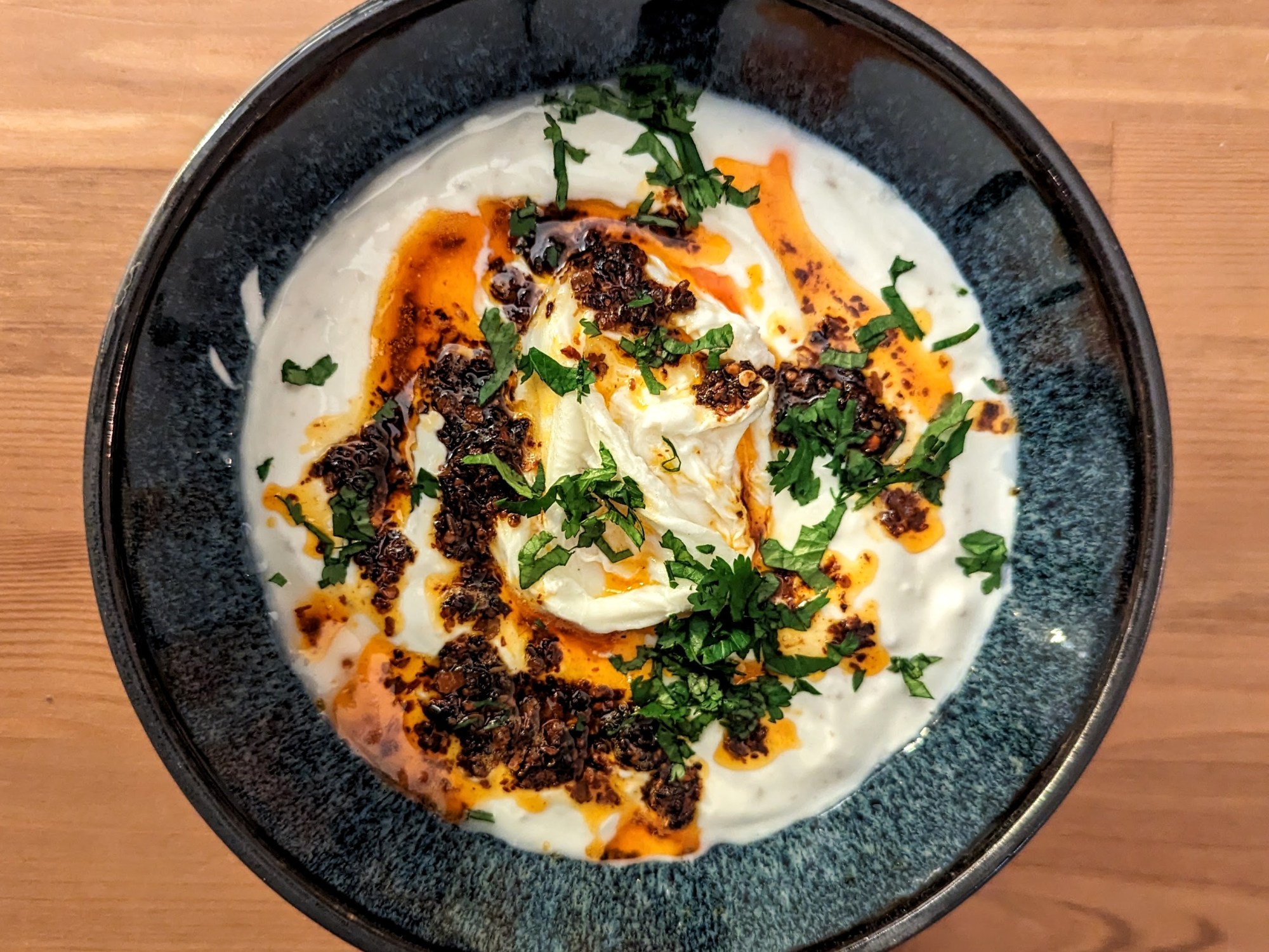 Verser le yaourt dans les bols et garnir d’œufs pochés. Verser le beurre au piment sur les œufs. Servir avec du pain