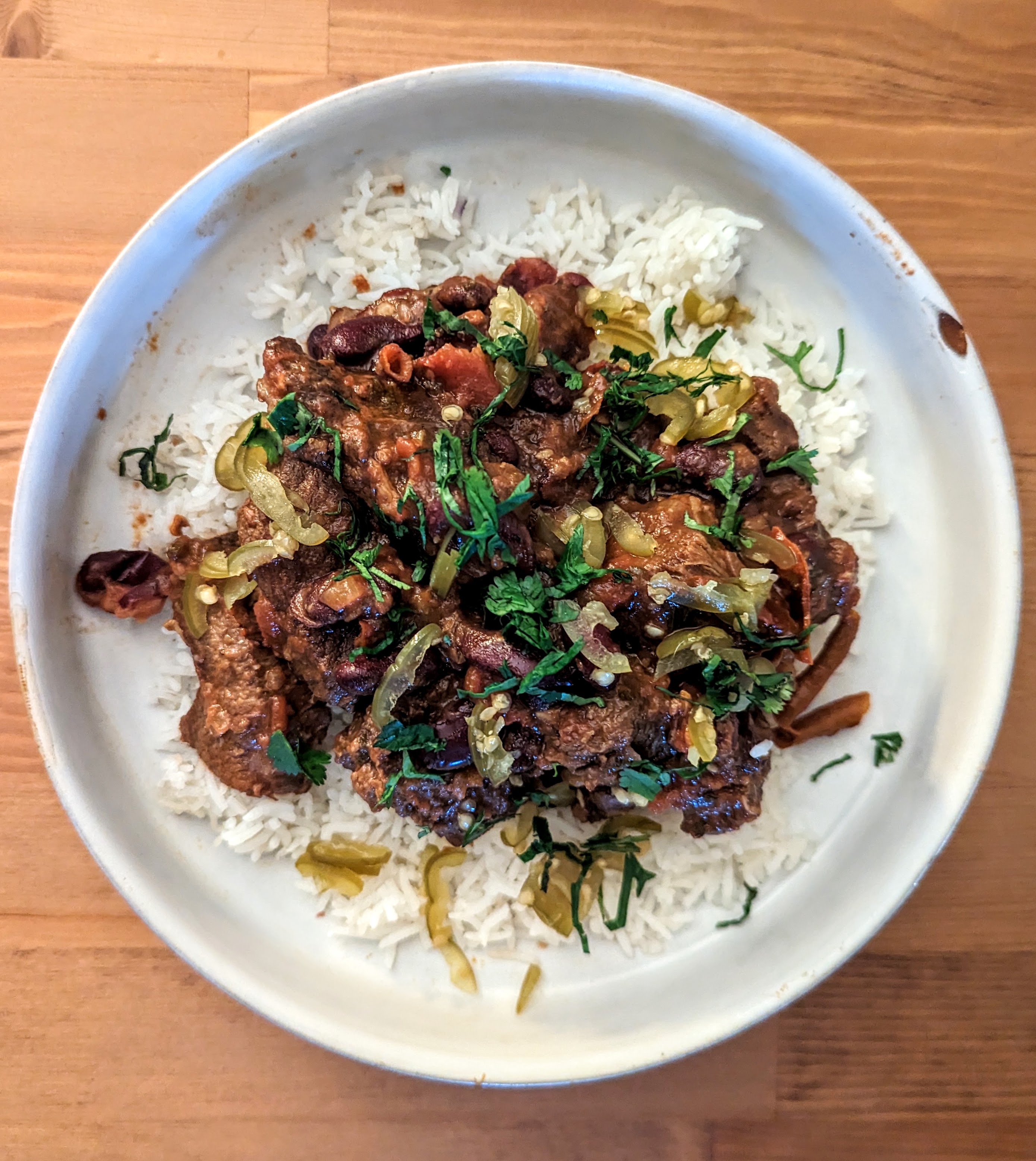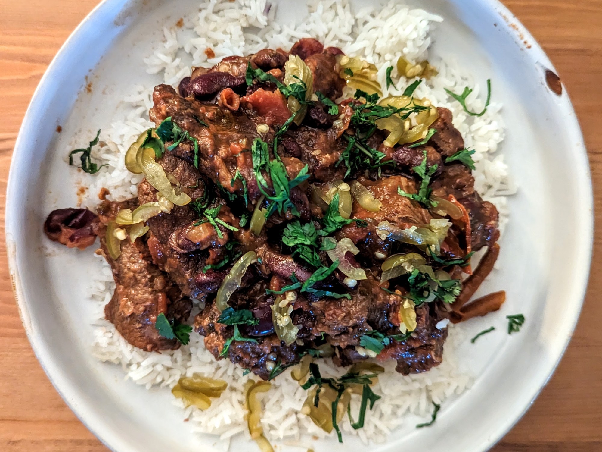 Servir avec riz, coriandre, jalapenos et éventuellement un peu de creme fraîche.