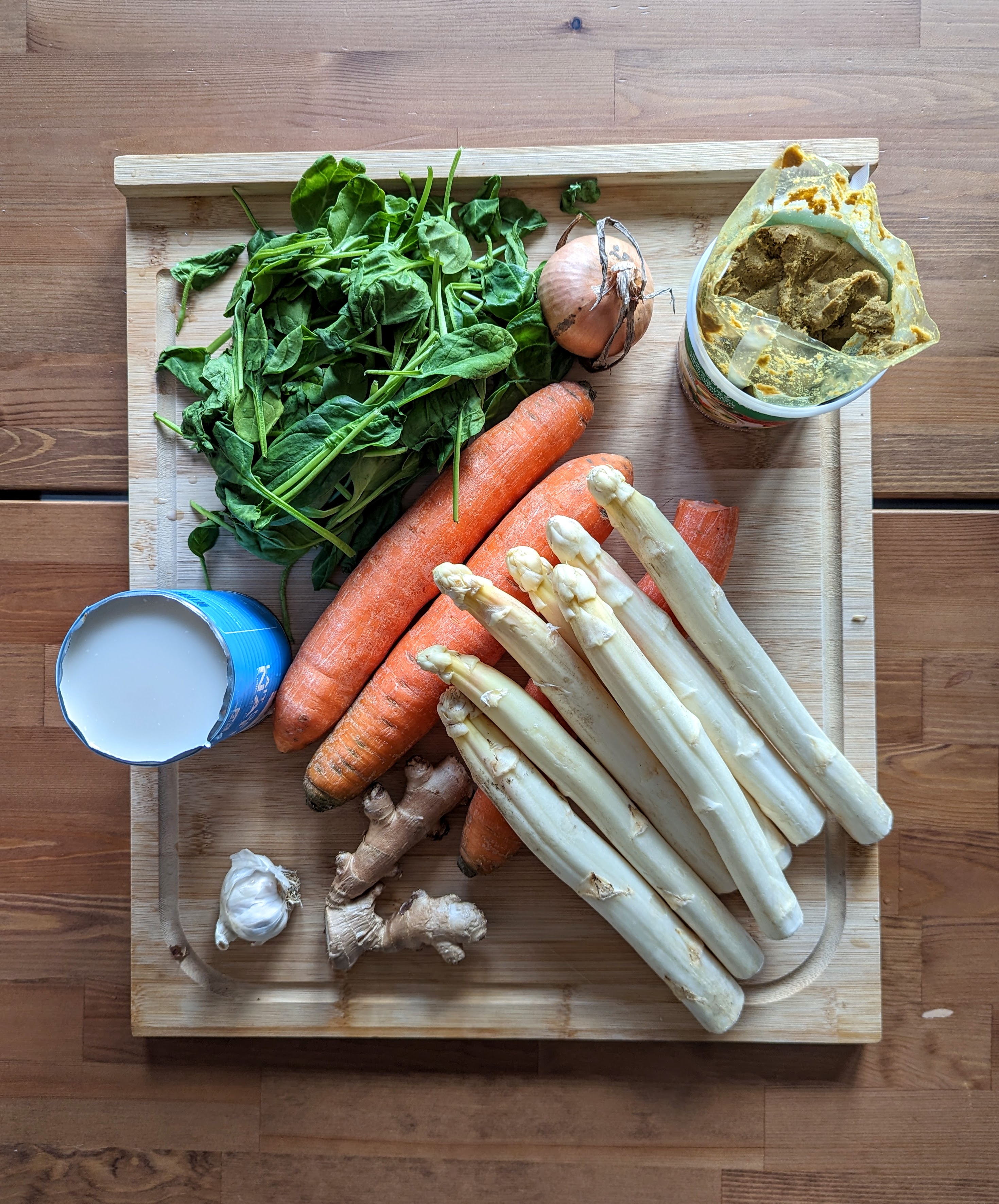 Faire dorer l’oignon, gingembre et ail dans une grande poêle sauteuse avec un peu d’huile a feu moyen. Ajouter le curry thaï et bien incorporer, puis les asperges et carottes.