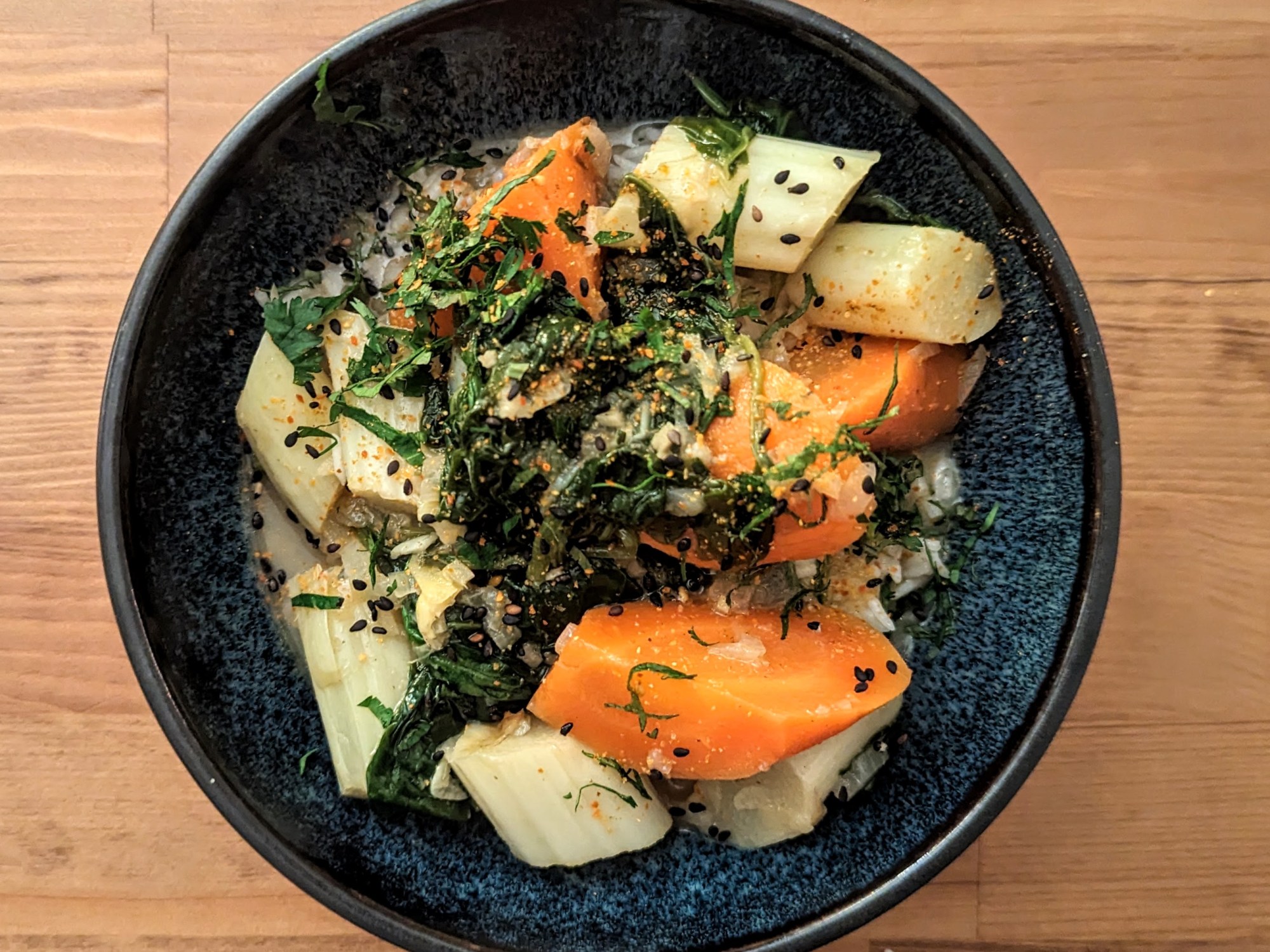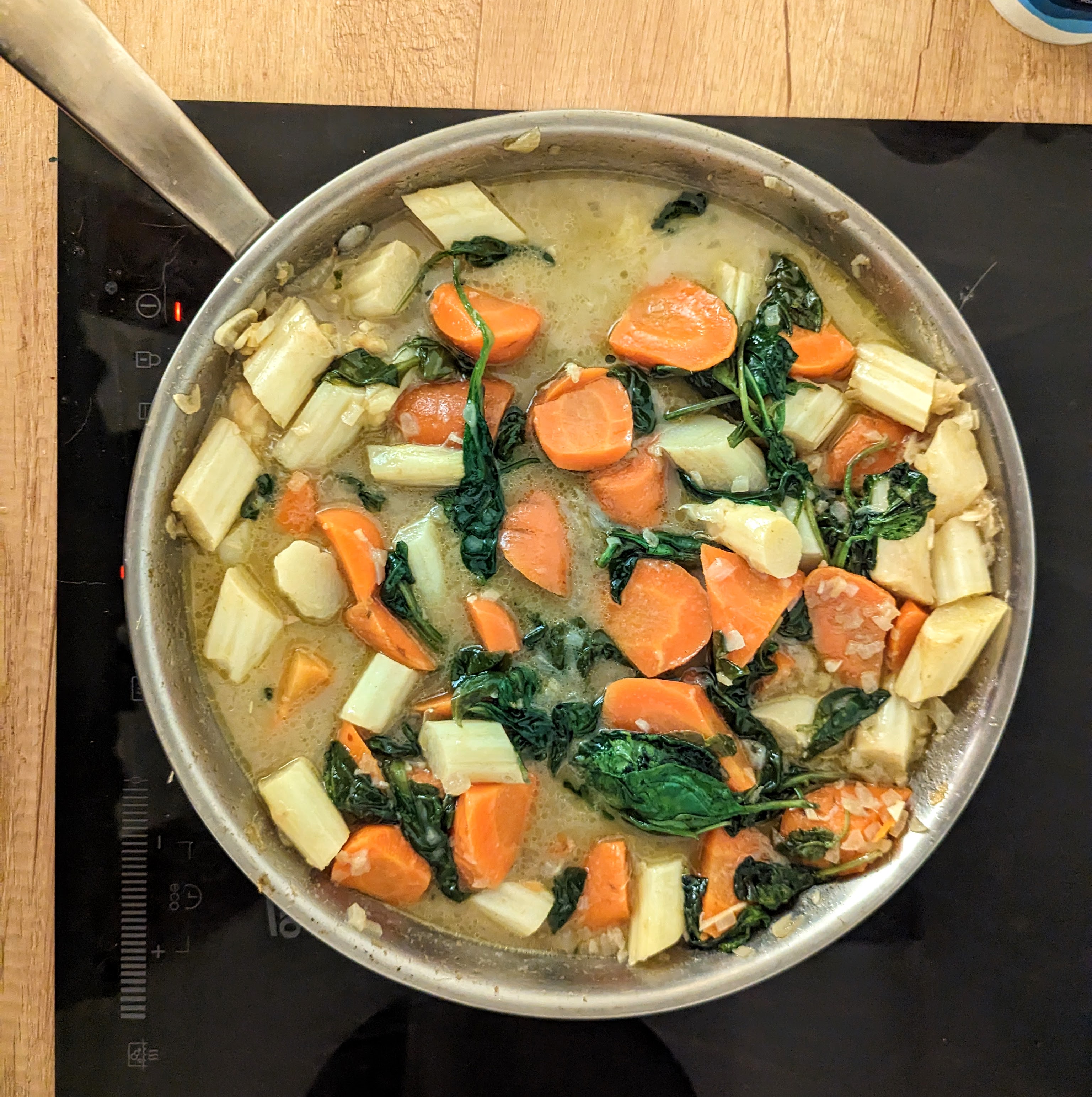 Une fois les legumes bien enrobés de la pate de curry, versez le lait de coco dans la casserole, avec le sucre et un peu d’eau si besoin. Mijoter jusque tendre.