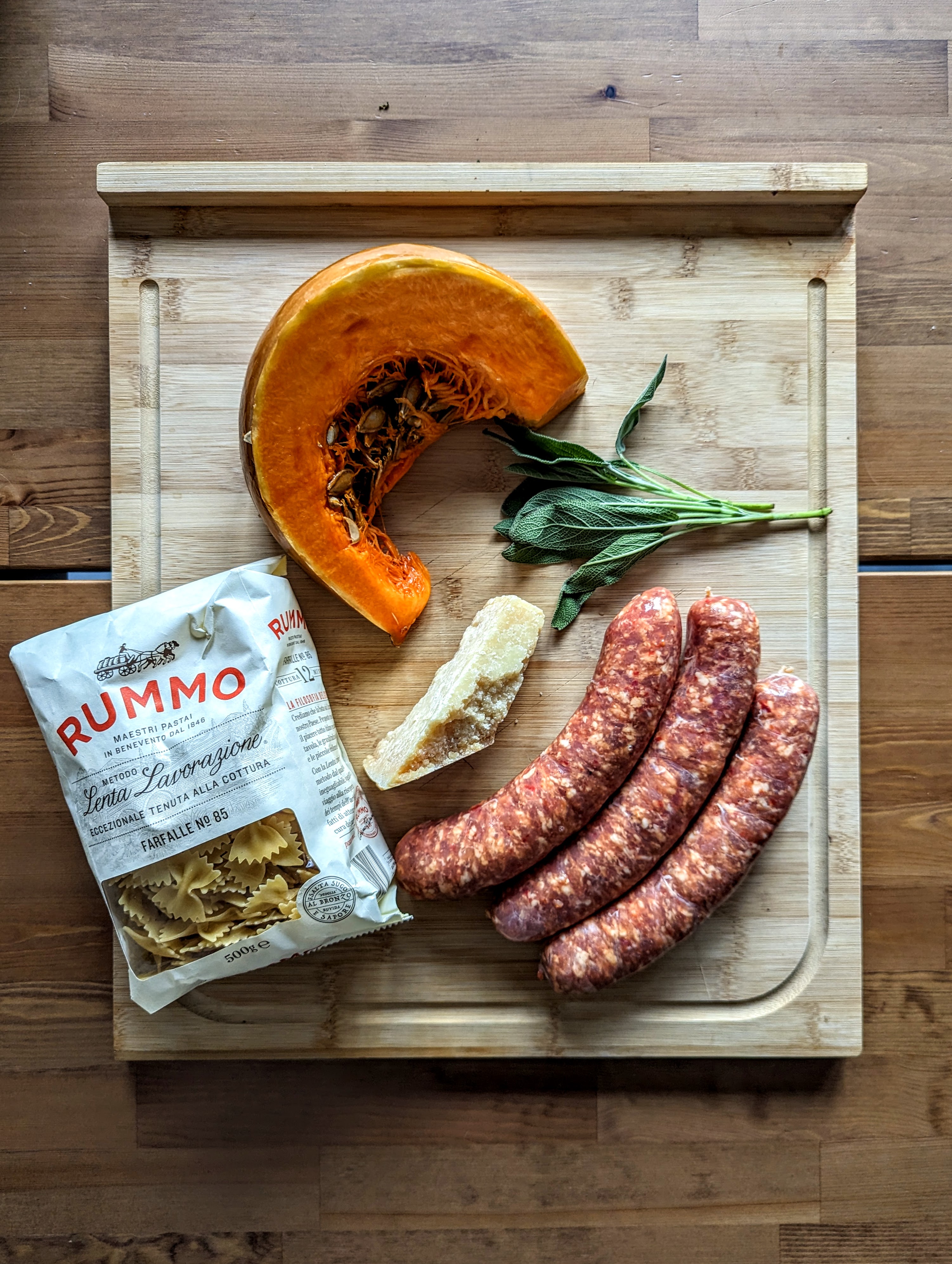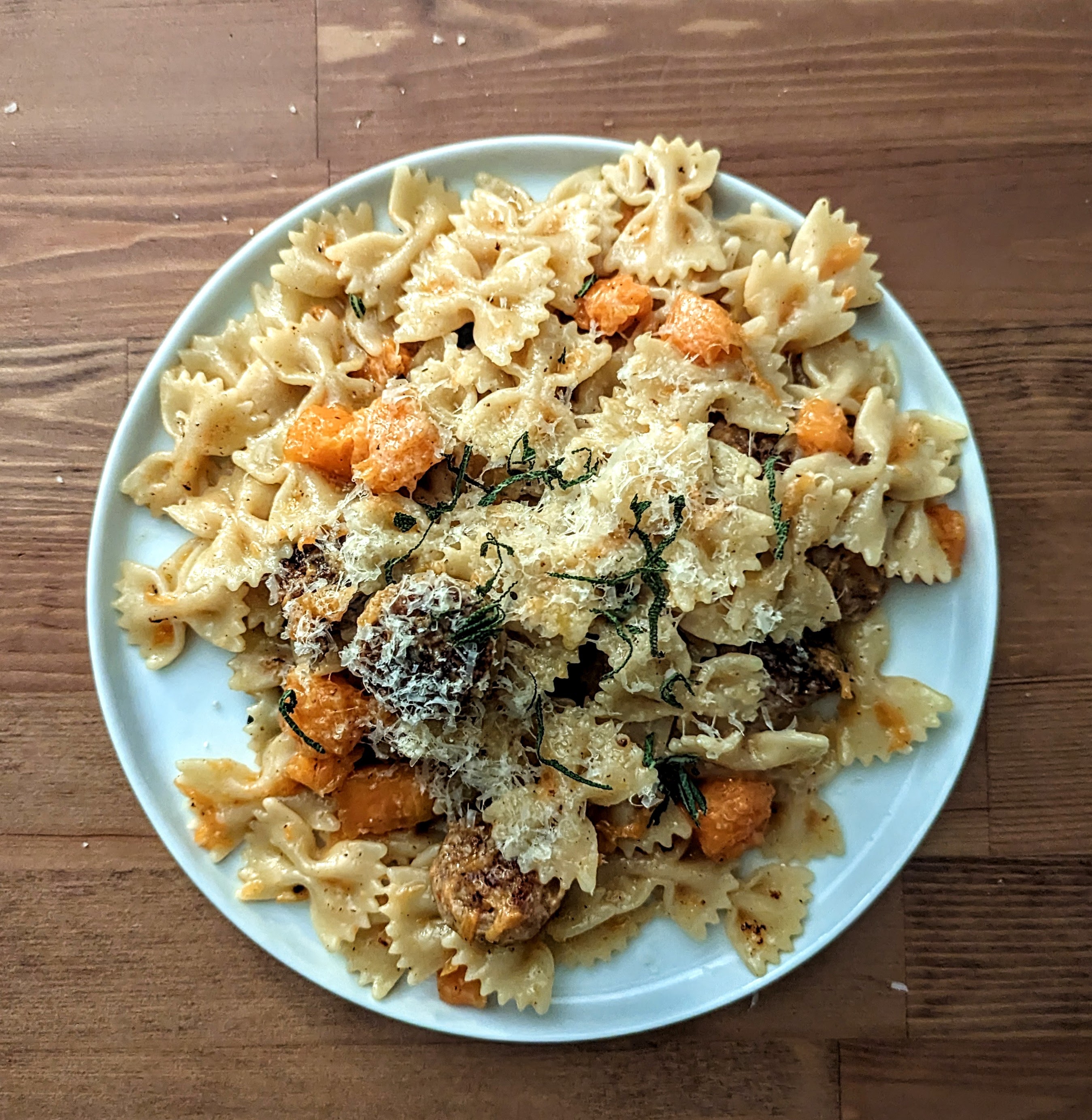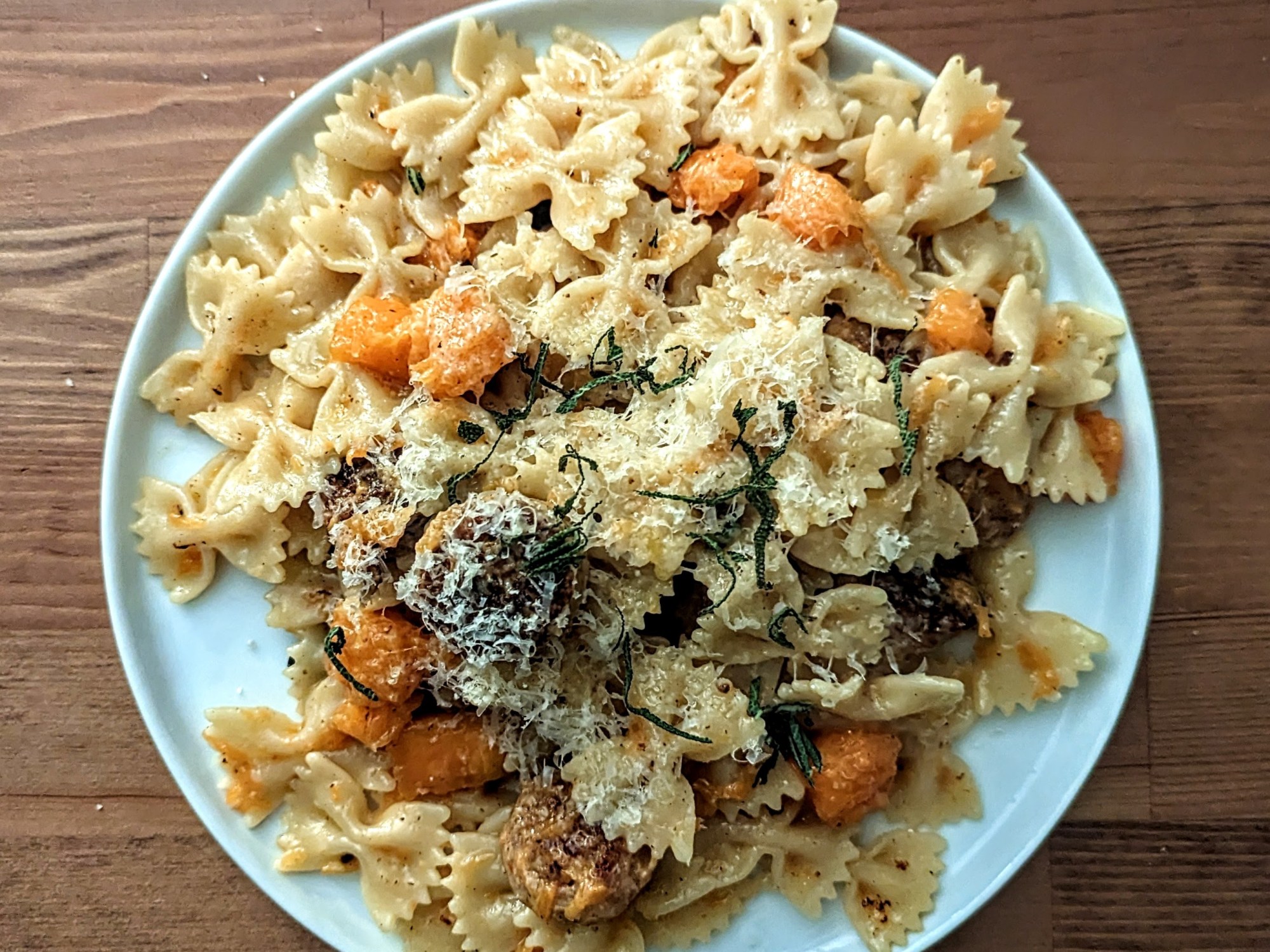 Lorsque la courge est bien dorée, ajoutez le beurre et la sauge. Cuire jusqu’à obtention d’un beurre noisette puis retirer du feu et ajouter les saucisses.