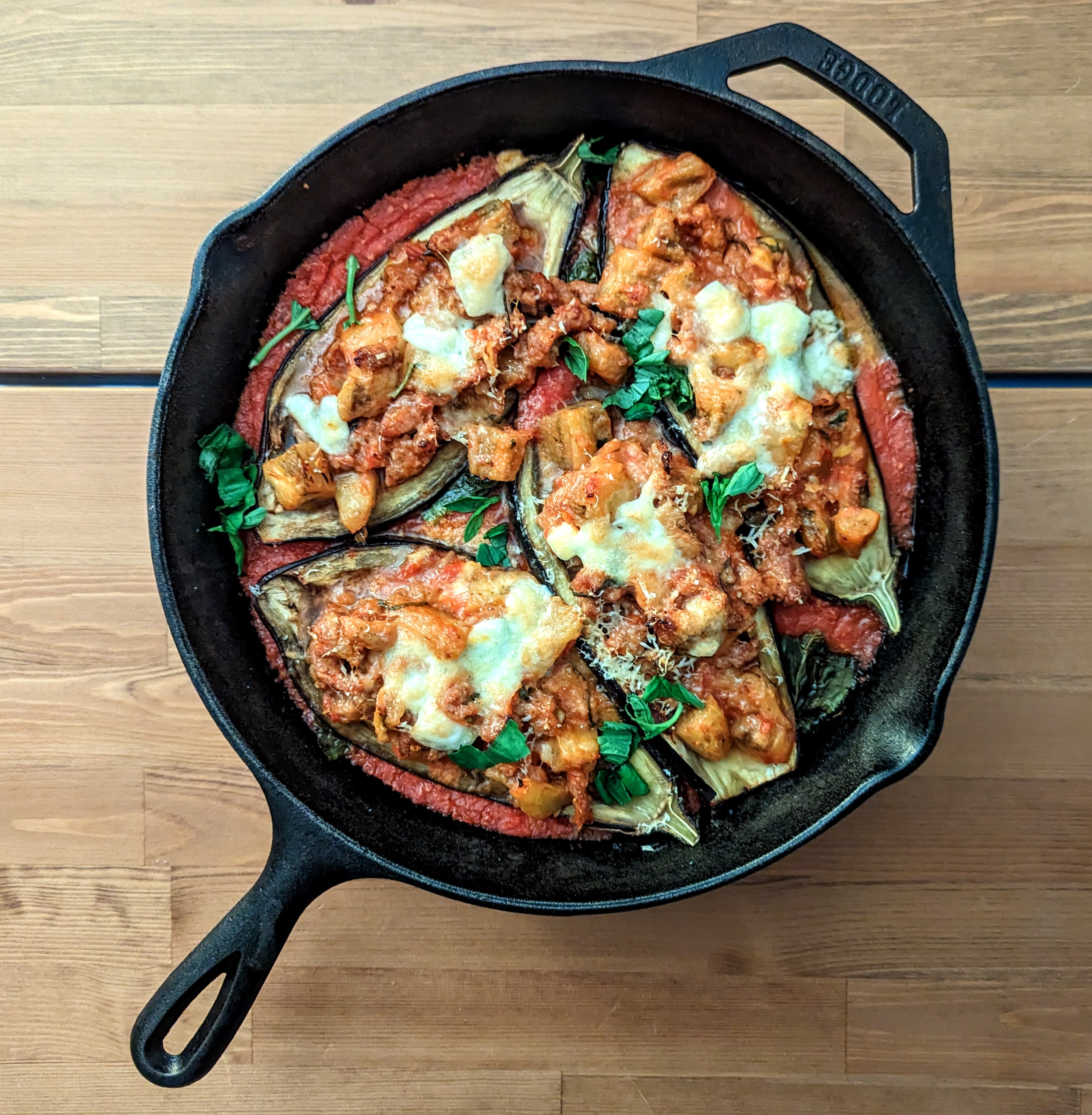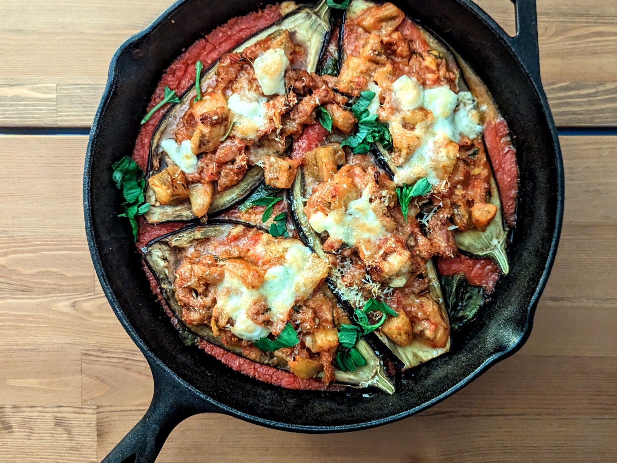 2. Réaliser la farce. Couper la chair d’aubergine en des de 1cm et mettre de cote. Chauffer 2 cs d’huile d’olive dans une poêle puis faire sauter les oignons a feux moyen 3-5 min. Y rajouter l’ail 1 minutes puis la farce. Faire cuire jusque plus rosé et que ça commence a dorer. Ajouter la chair d’aubergine avec du sel et poivre selon goût. Cuire jusque doux et doré. Ajouter 100ml de sauce tomate et le basilic. Hors feu mélanger la moitie du fromage.