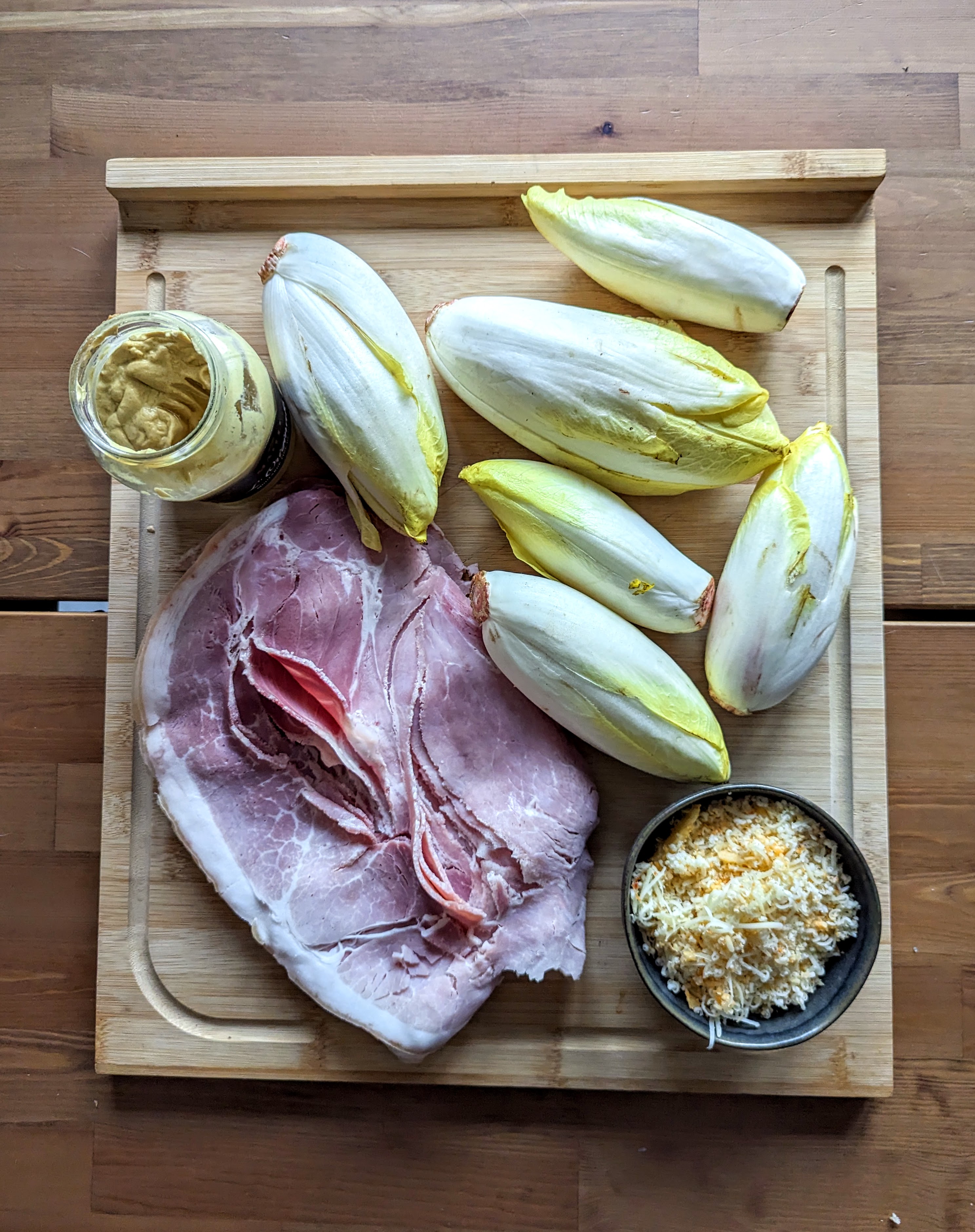 4. Placer les endives préparées dans un plat allant au four. Verser la sauce béchamel, saupoudrer le gruyère râpé dessus.