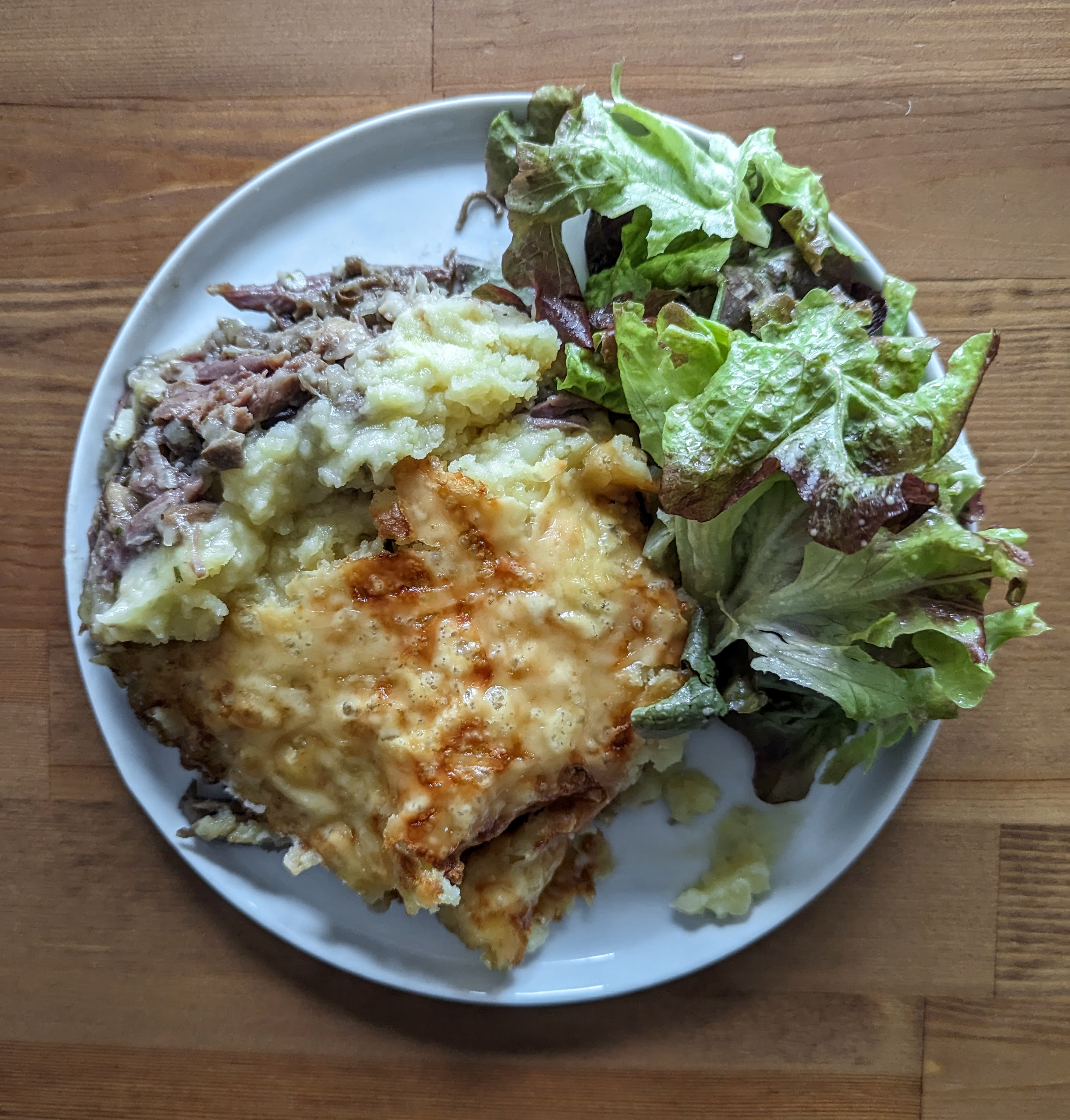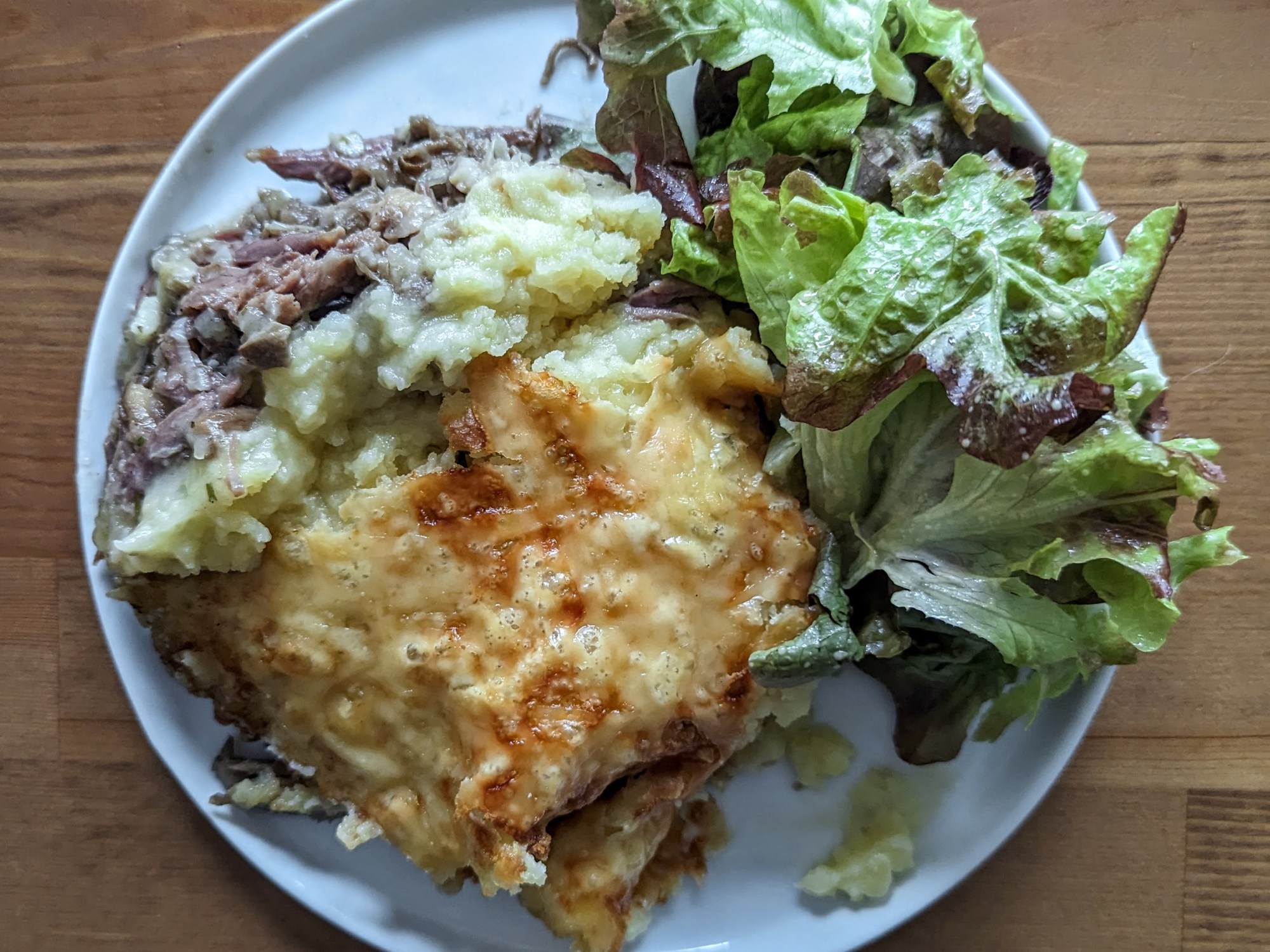 Graisser un grand plat à four avec de la graisse de canard. Y déposer le mélange de viande et le recouvrir de purée de pommes de terre. Saupoudrer le fromage et cuire au four pendant environ 25 minutes, ou jusqu’à ce que la viande soit bien chaude et dorée sur le dessus.