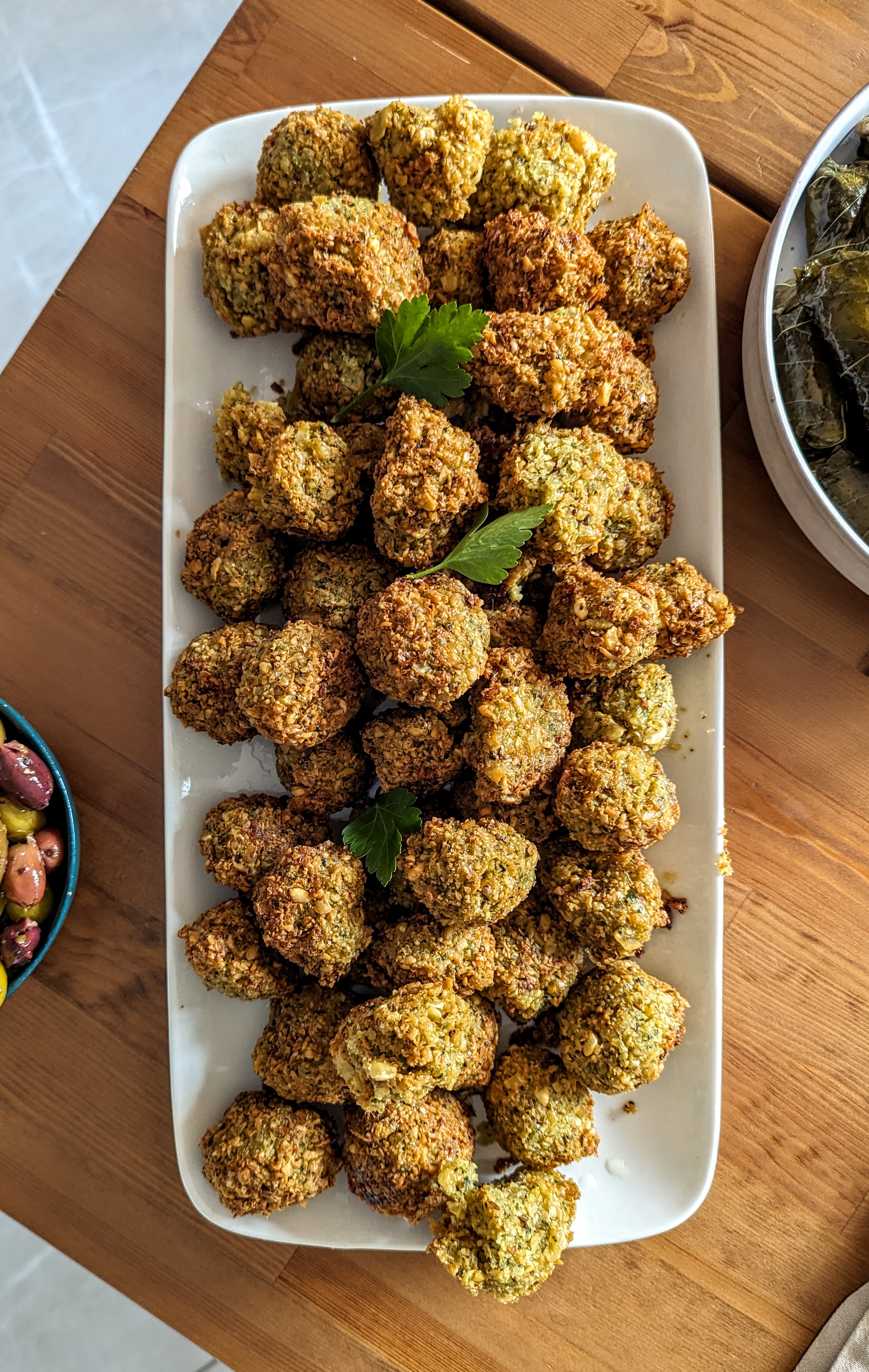 Mixer les autres ingrédients (sauf l’huile) puis mélanger avec les pois-chiches. Ajuster l’assaisonnement.