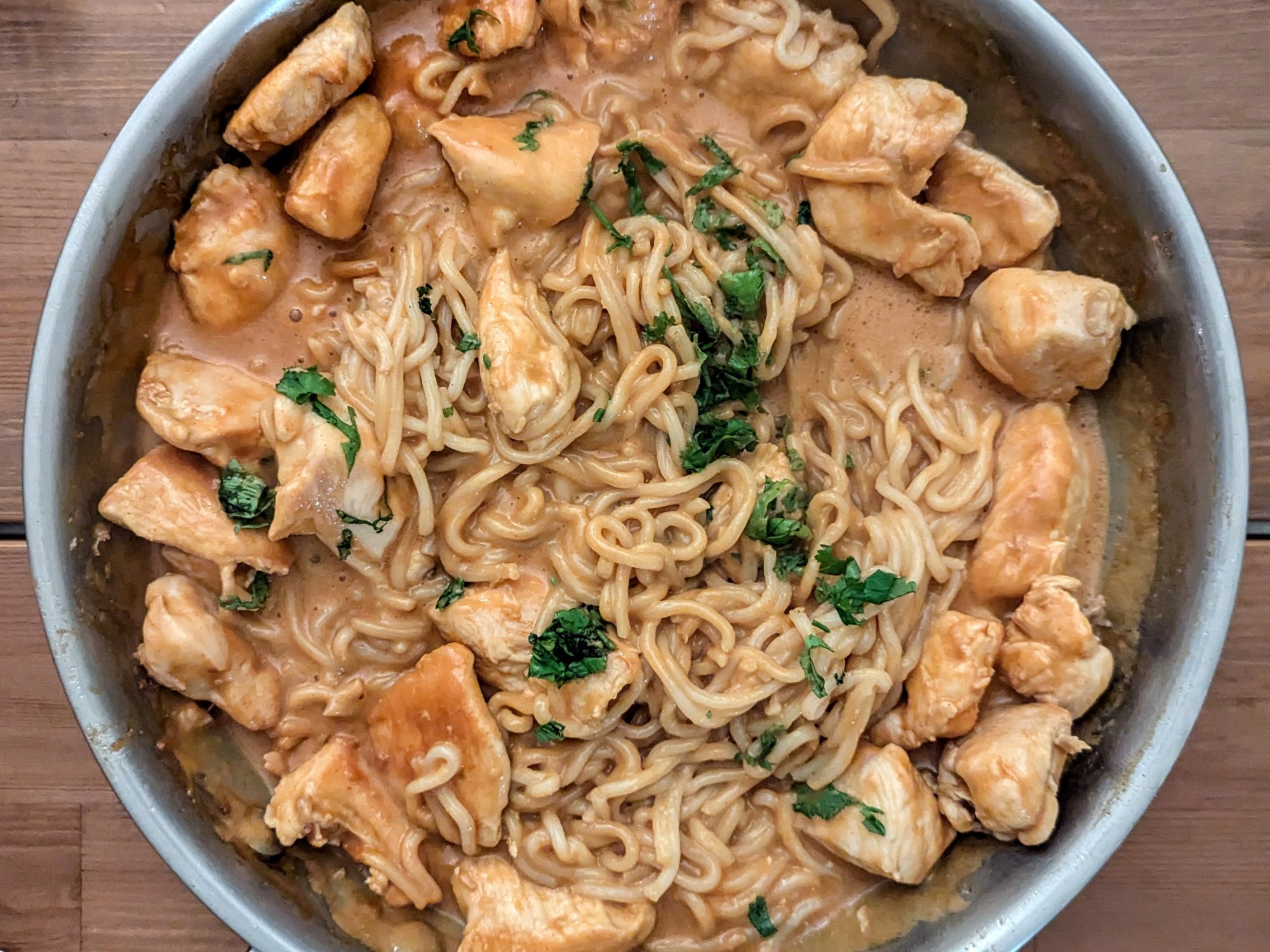 Mélanger tout sauf le poulet et les nouilles dans un faitout a feux moyen, et faire mijoter 5 min. Délayer avec l’eau au besoin