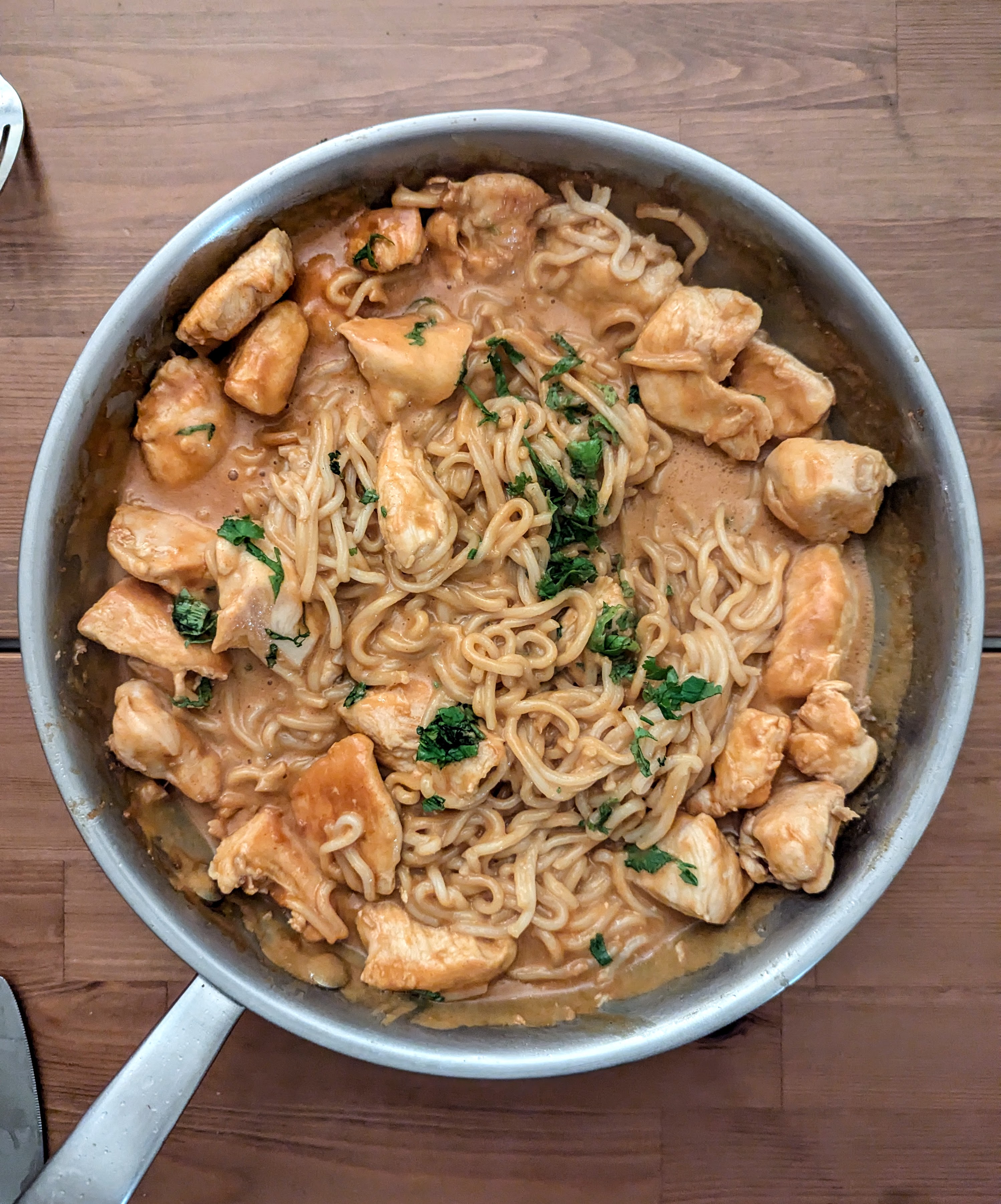 Faire sauter rapidement le poulet, les nouilles et la sauce pour mélanger. Servir