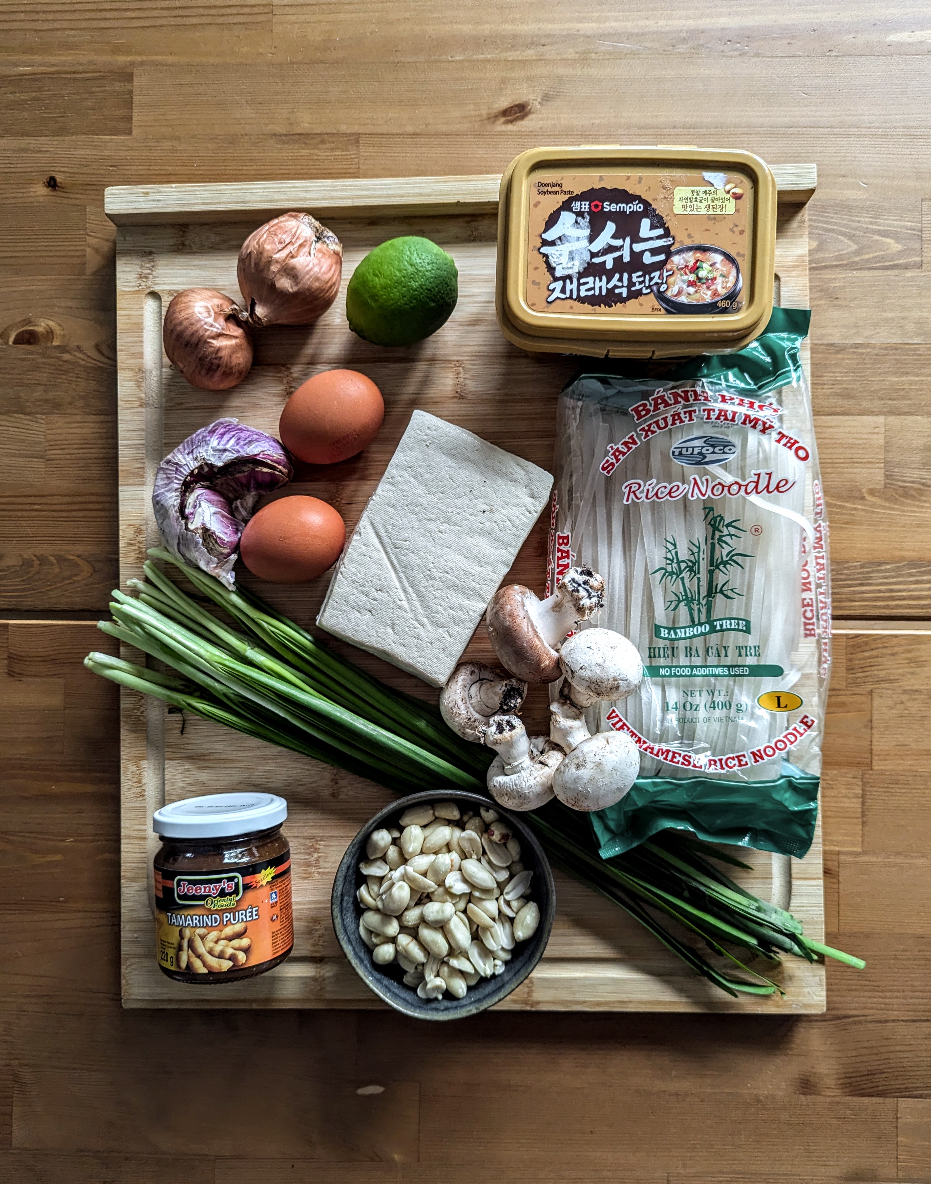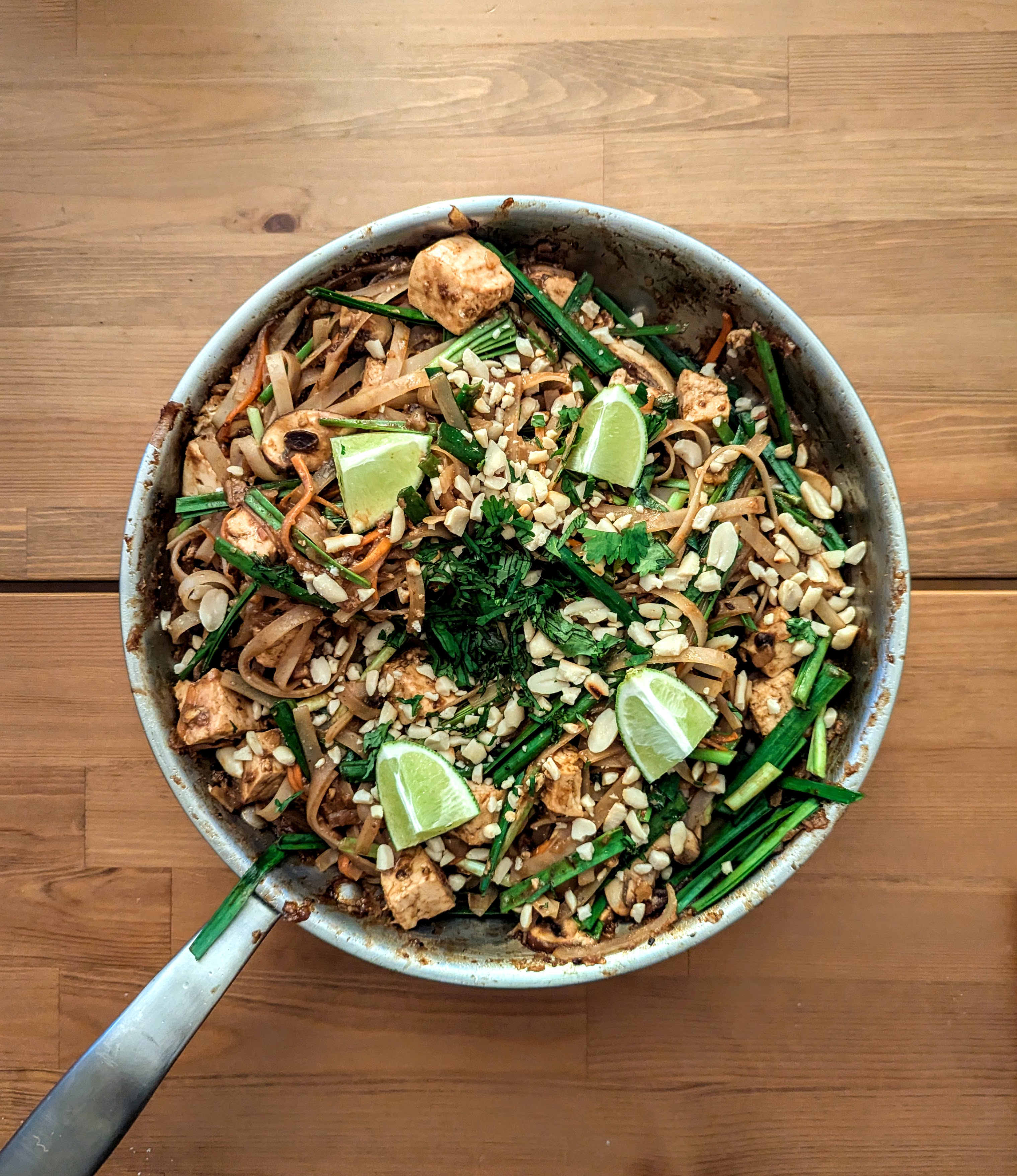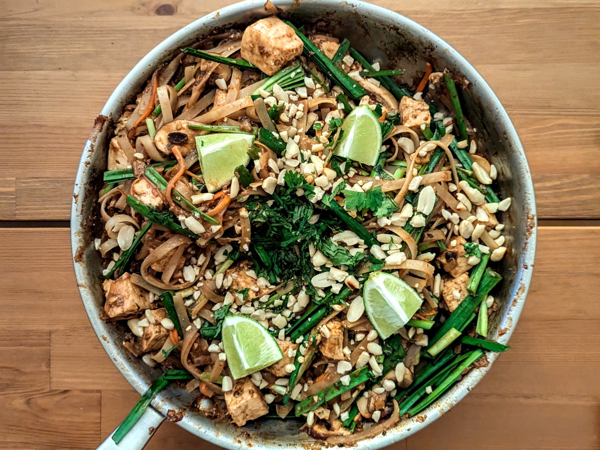 Déglacez avec le mélange de sauce, puis ajoutez les nouilles de riz, les champignons et le tofu. Remuez jusqu’à ce que toute la sauce soit absorbée. Assaisonnez au goût