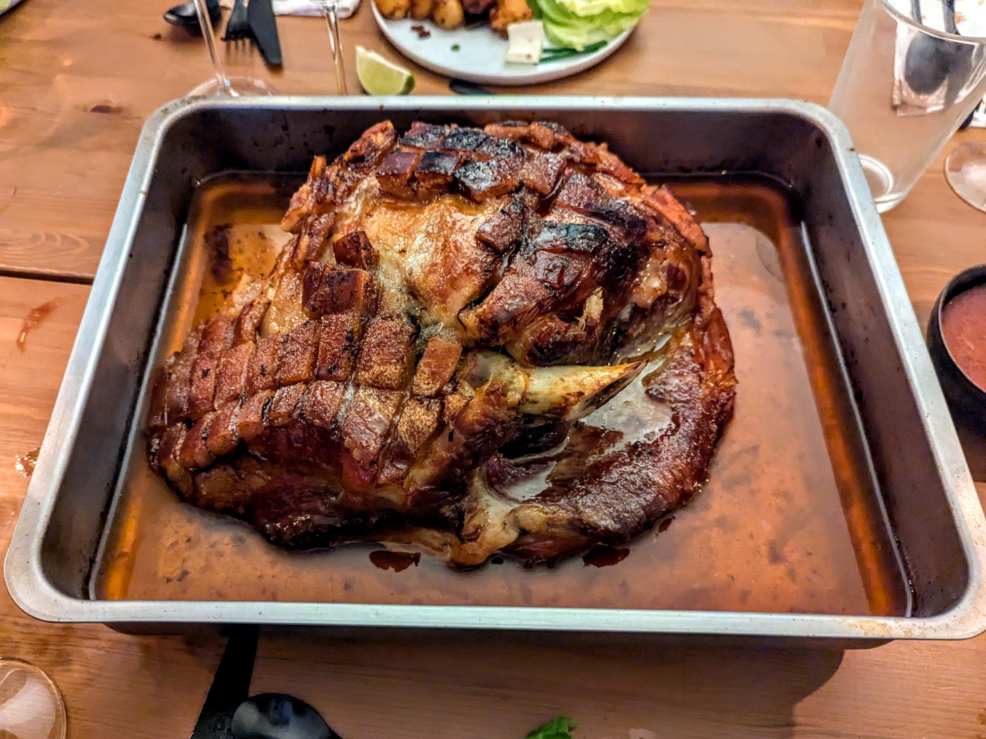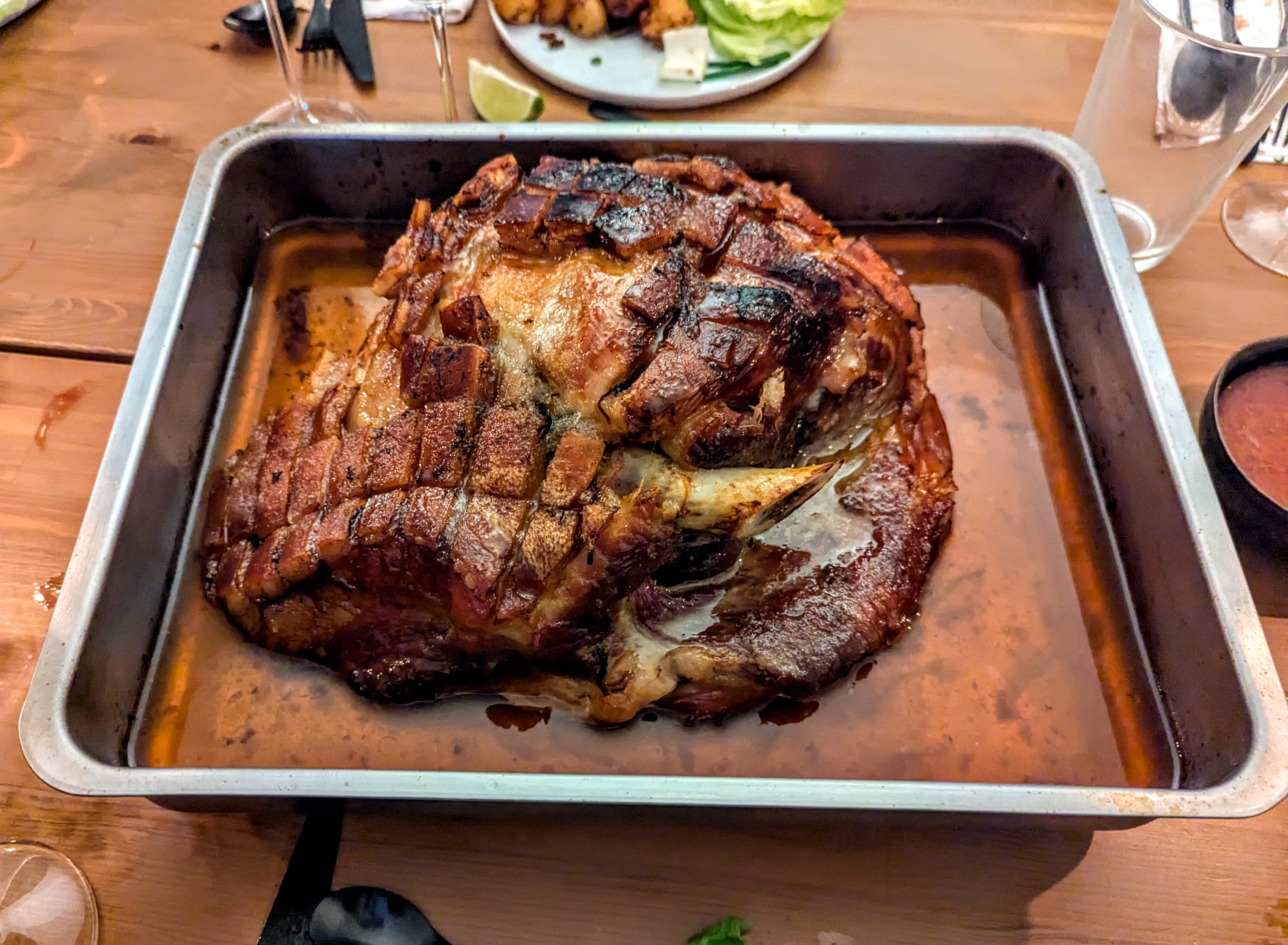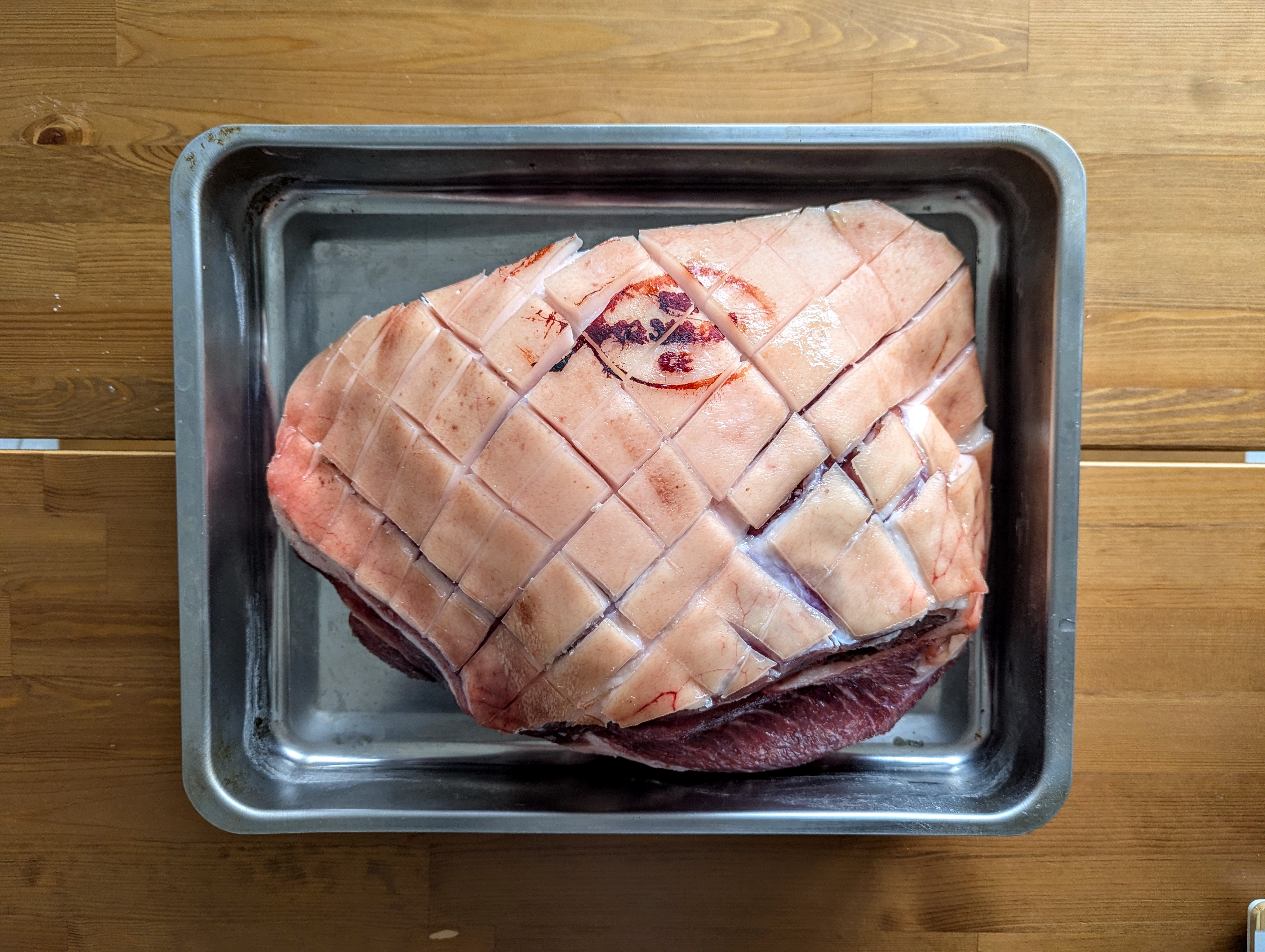 Couvrir la viande d’un mélange de sucre et de gros sel et mariner une nuit. Vous pouvez entamer la couenne au couteau en damier si vous voulez pour faciliter le service.