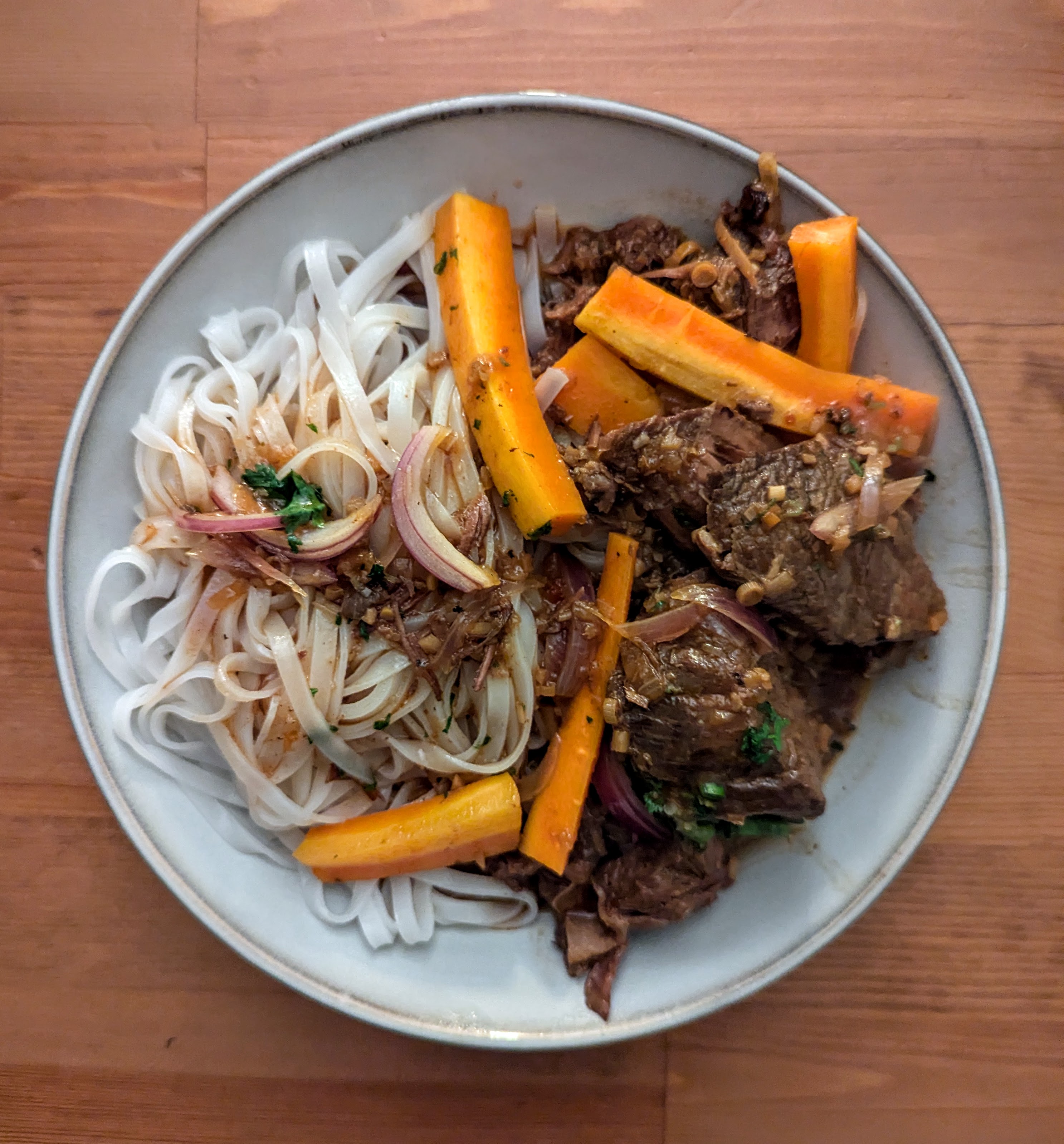 Pour servir, retirez et jetez les tiges de citronnelle, puis versez le bò kho dans de grands bols (sur des nouilles phở si vous le souhaitez). Garnissez généreusement de poivre noir et garnissez.