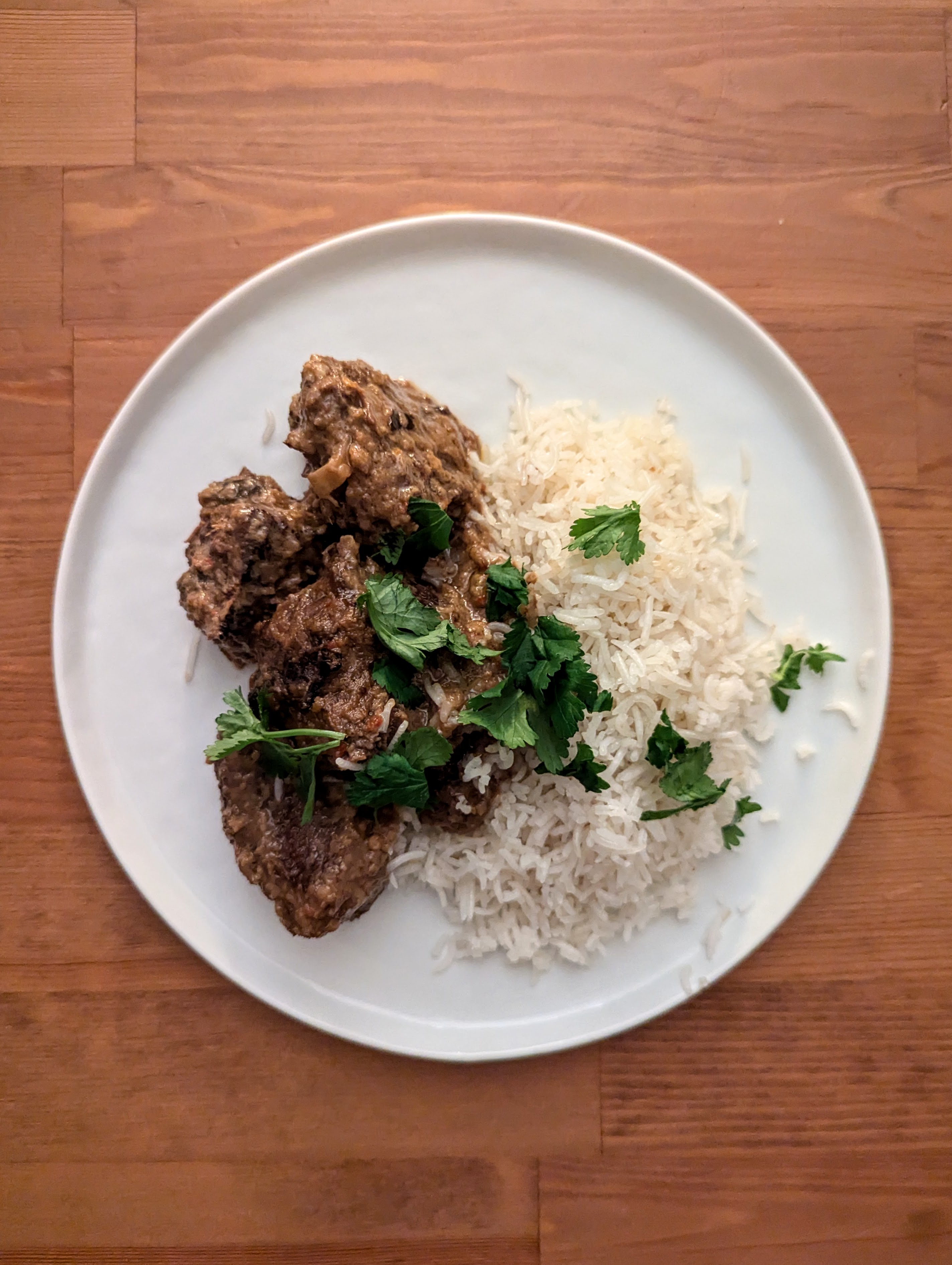 Découvrir et faire réduire la sauce pendant 30 à 40 minutes a feu moyen, en remuant régulièrement jusqu’à ce que le bœuf brunisse et que la sauce se réduise en une pâte qui enrobe la viande qui doit être tendre (sinon poursuivez la cuisson en rajoutant un peu de bouillon.