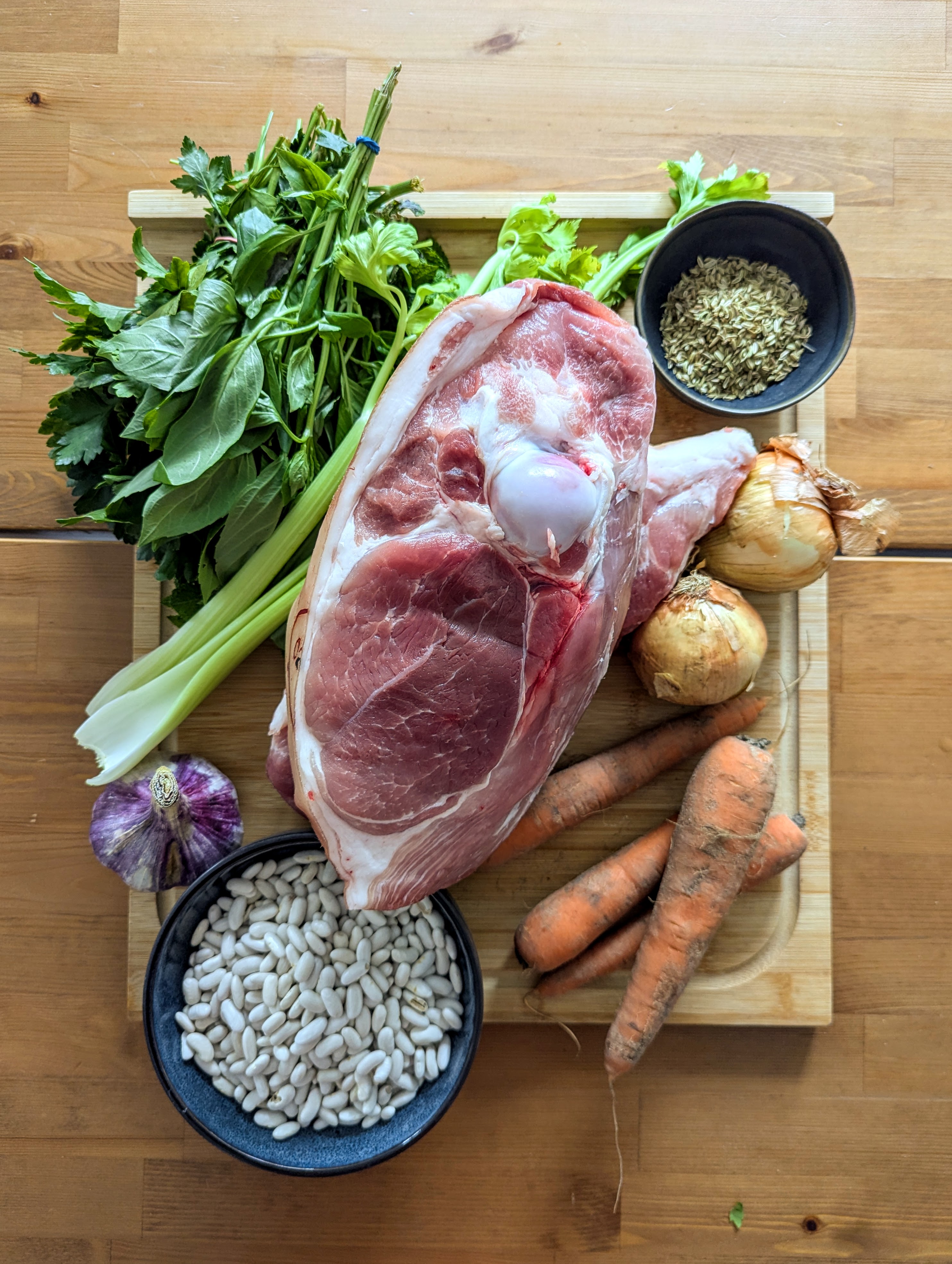 La veille faites tremper les haricots dans un grand volume d’eau salée puis pilez les graines de fenouil au mortier et au pilon et mélangez-les avec le de piment. Assaisonnez généreusement le porc avec du sel et le mélange de graines de fenouil et de piment, en pressant les épices dans la viande. Laissez-le porc au frigo la nuit.