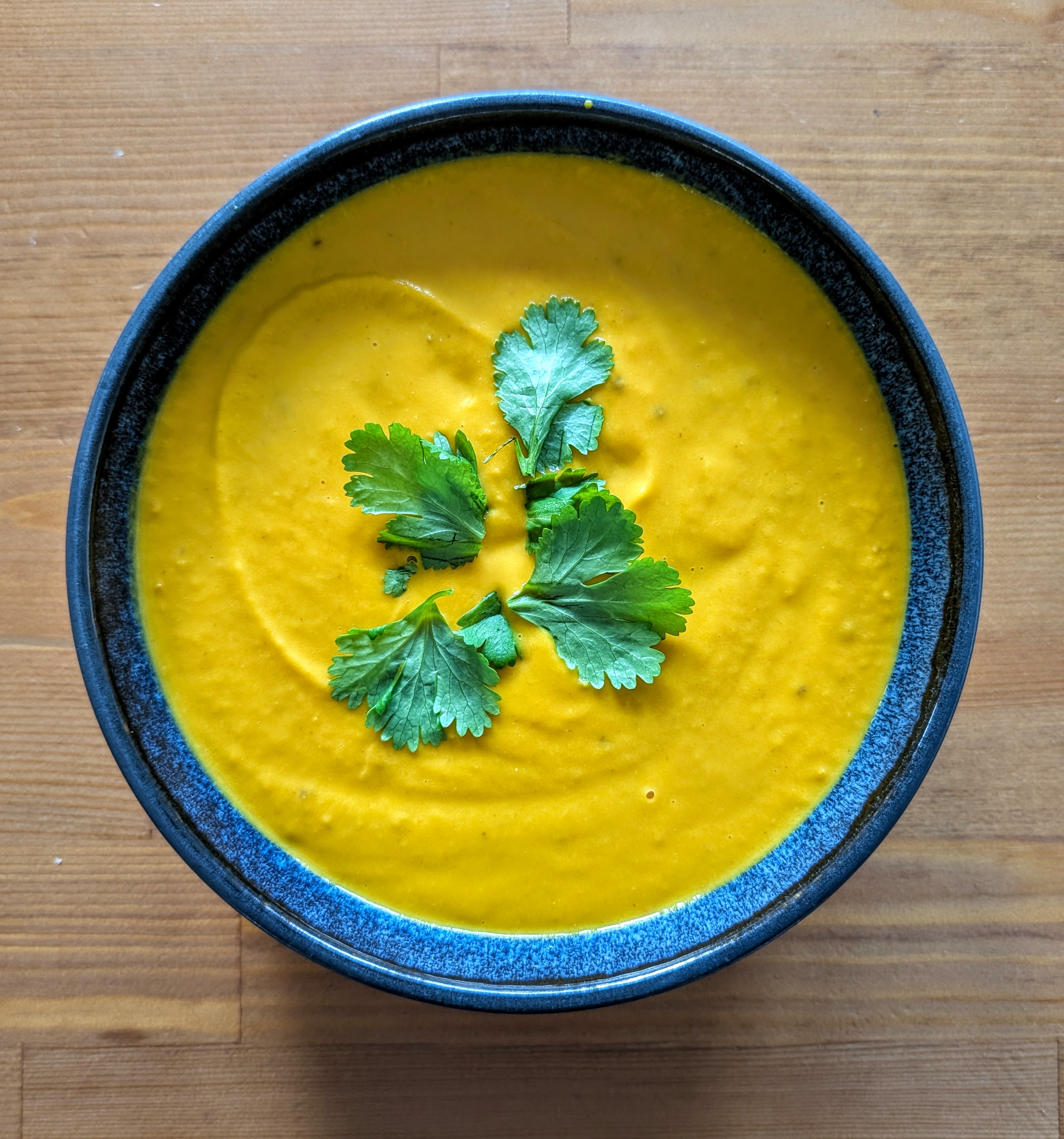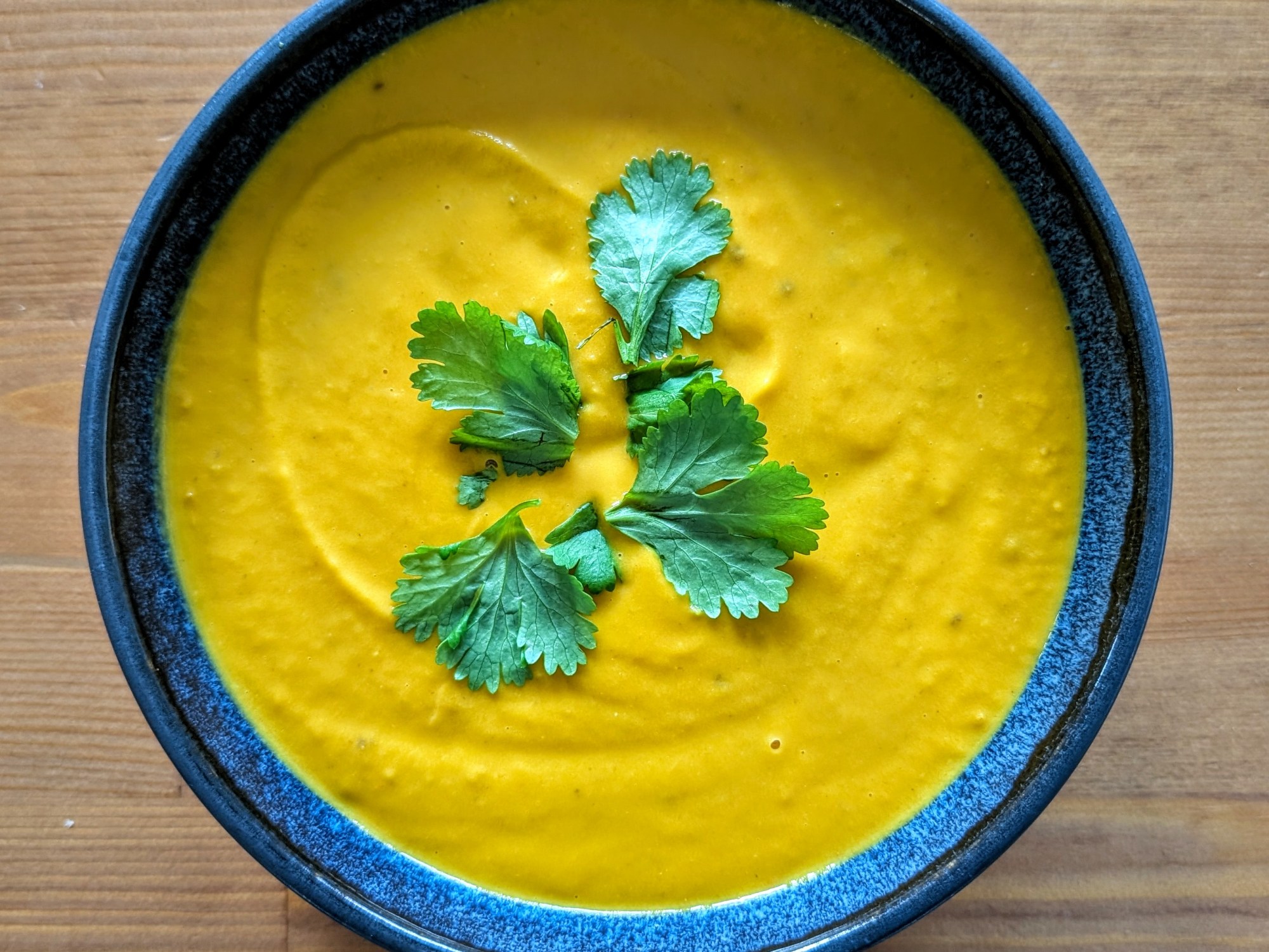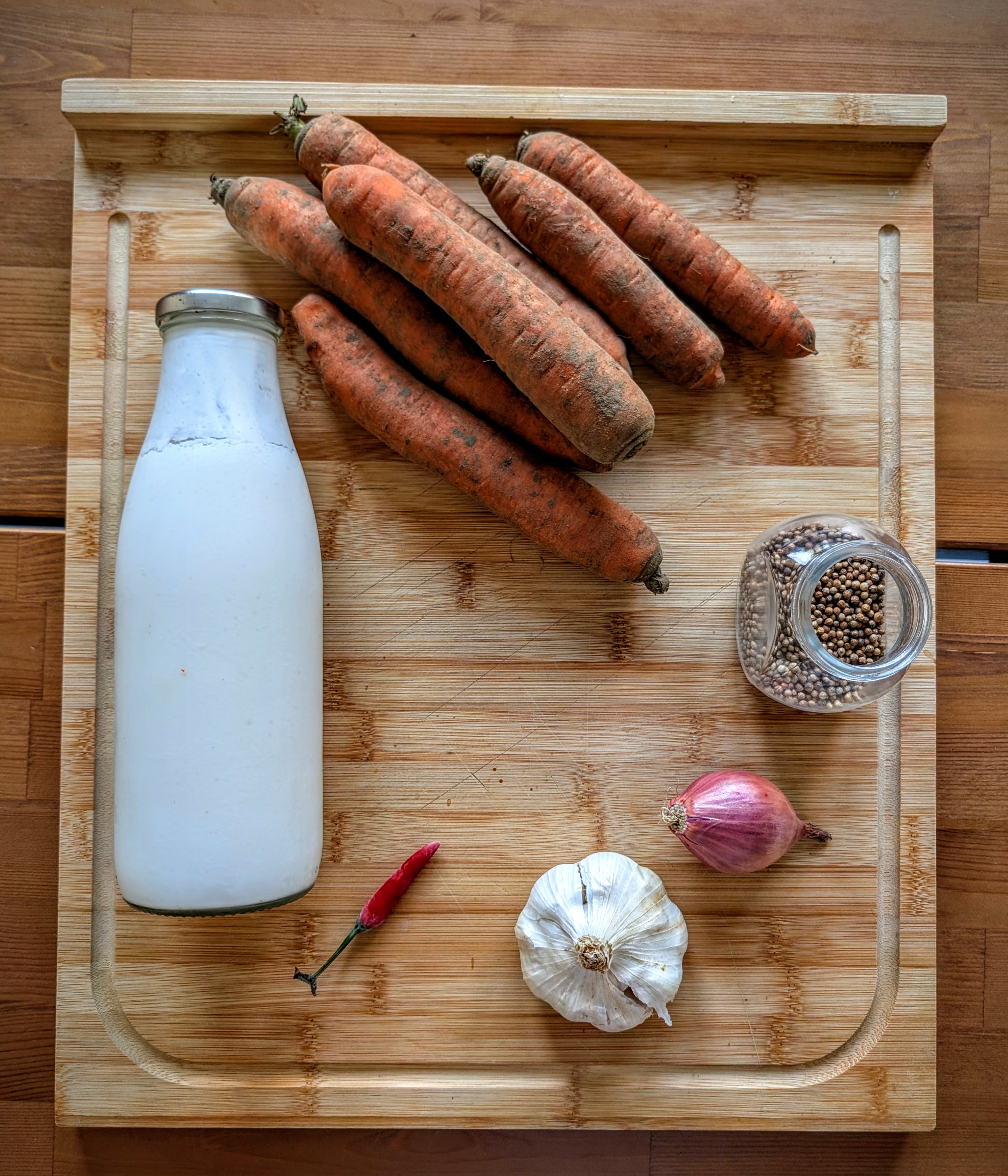 Quand c’est aromatique ajouter les carottes et colorez-les. Ajouter le lait de coco et autant en eau. Faites frémir le temps que les carottes deviennent tendres, environ 20-30 minutes.