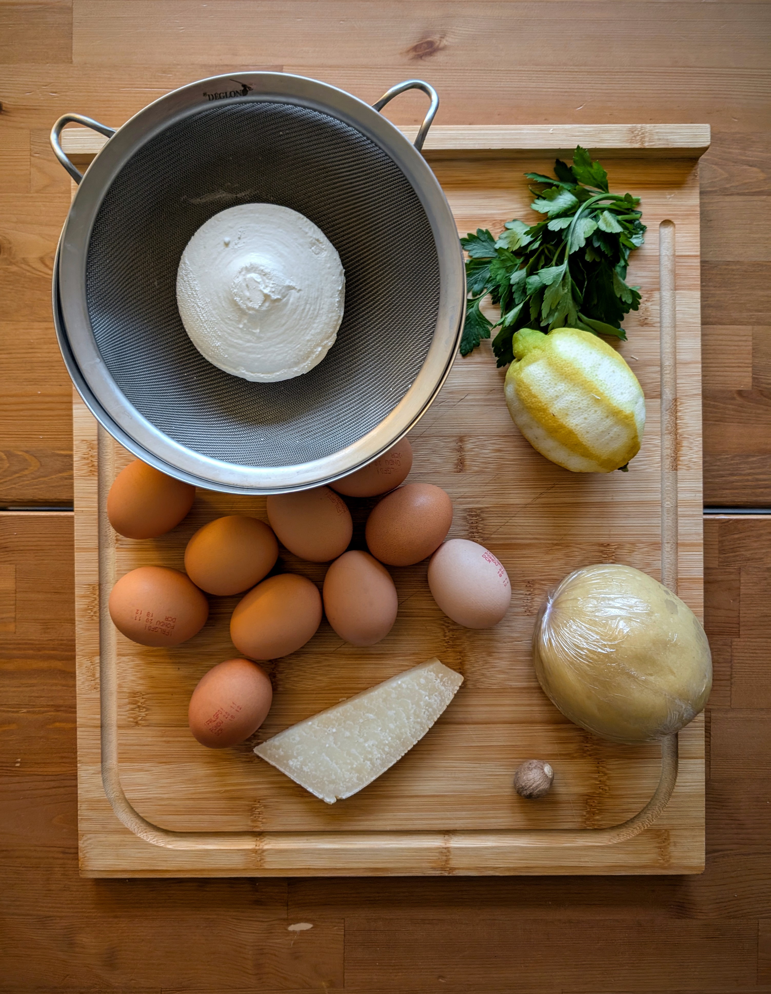 Mélanger ensemble la ricotta, jus de citron, parmesan, herbes fraîches et muscade au gout. Salez et mettre en poche a douille.