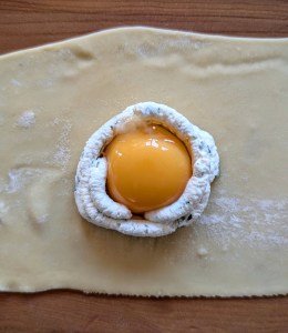 Étalez la pate. Faire au total 10 puits avec la ricotta sur la moitié de la pasta. Mettre un jaune d’œuf dans chaque puits et couvrir l’ensemble avec l’autre moitié de la pasta. Évacuer un maximum d’air et appuyer autour des puits pour fermer les raviolis.
