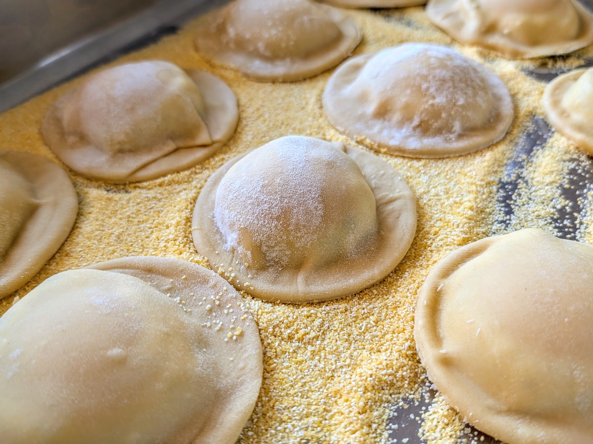 Étalez la pate. Faire au total 10 puits avec la ricotta sur la moitié de la pasta. Mettre un jaune d’œuf dans chaque puits et couvrir l’ensemble avec l’autre moitié de la pasta. Évacuer un maximum d’air et appuyer autour des puits pour fermer les raviolis.