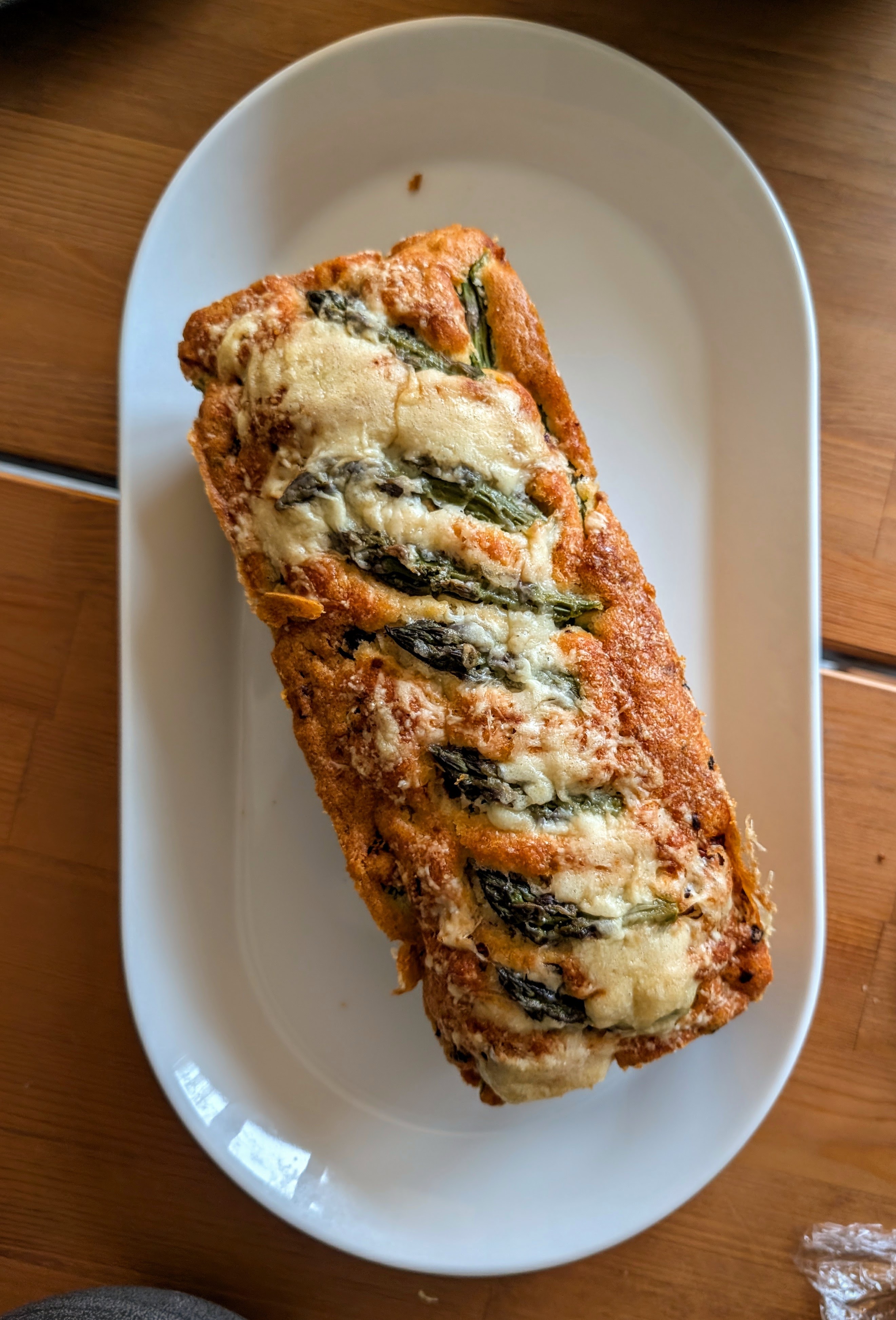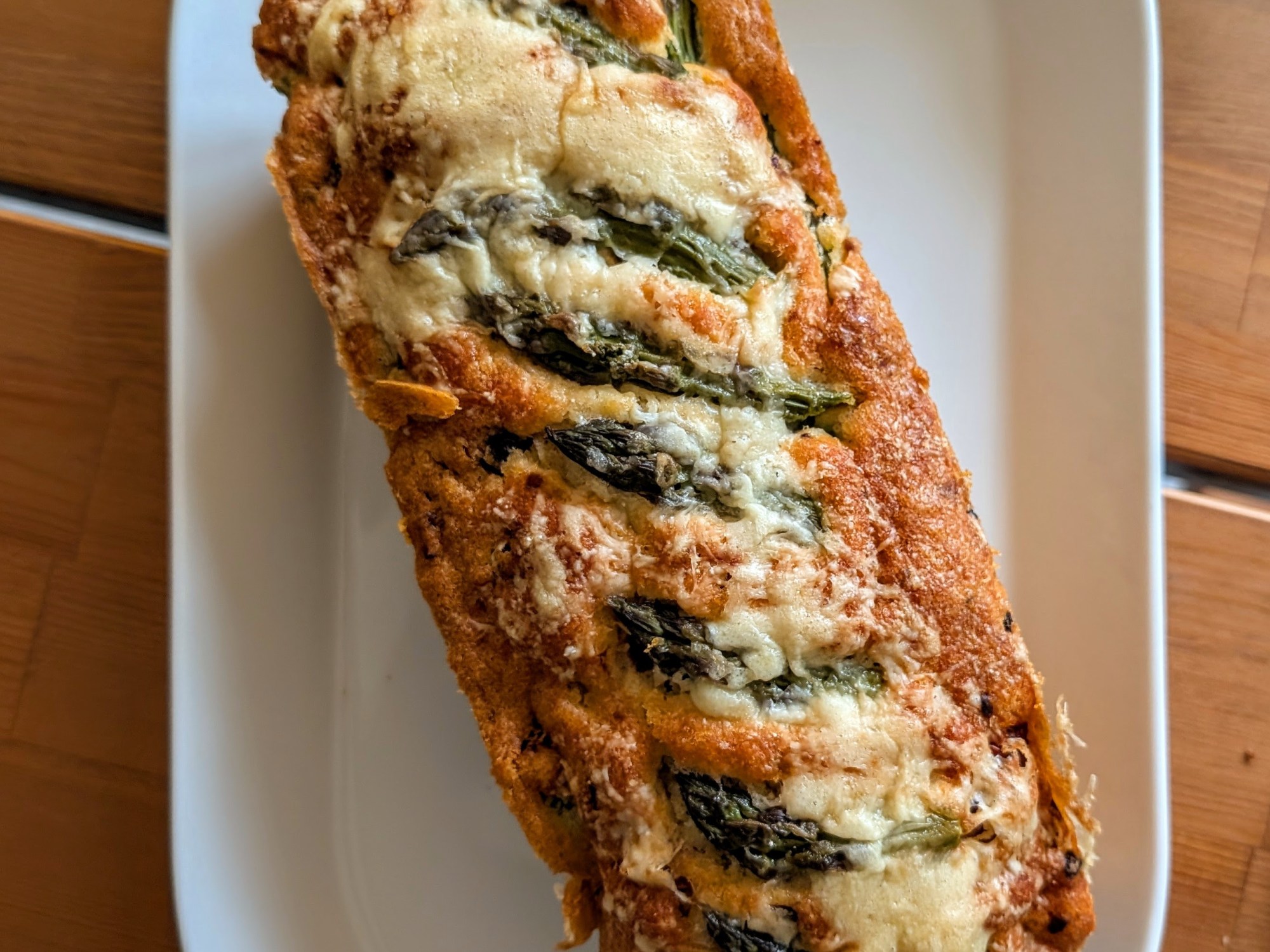 Ajoutez le reste des asperges, les tomates, les olives et les deux tiers du fromage à la pâte. Versez la préparation dans le moule. Parsemez du reste de fromage. Faites cuire au four pendant 35 à 40 minutes, jusqu’à ce que le gâteau soit ferme au toucher.